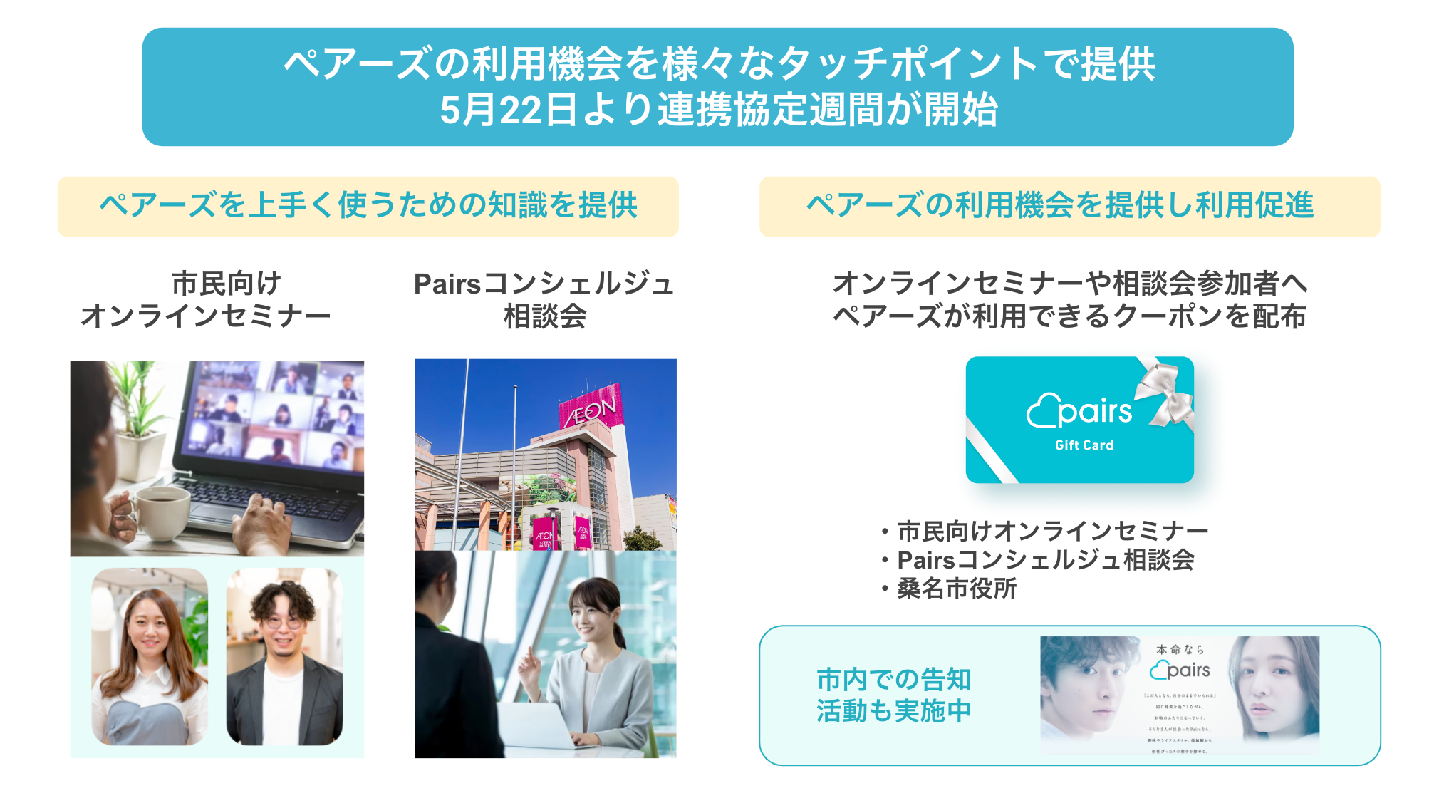 本事業では、オンラインセミナーやPairsコンシェルジュによる恋活・婚活相談会を開催し、ペアーズに関する知識や、サービスを上手に活用するためのアドバイスを提供します。また、各イベントへご参加いただいたシングル(独身・交際相手なし)の方へ、ペアーズの有料機能を一定期間ご利用いただけるお試しクーポンを配布することで利用機会を提供し、桑名市内の出会いと恋愛を促進します。