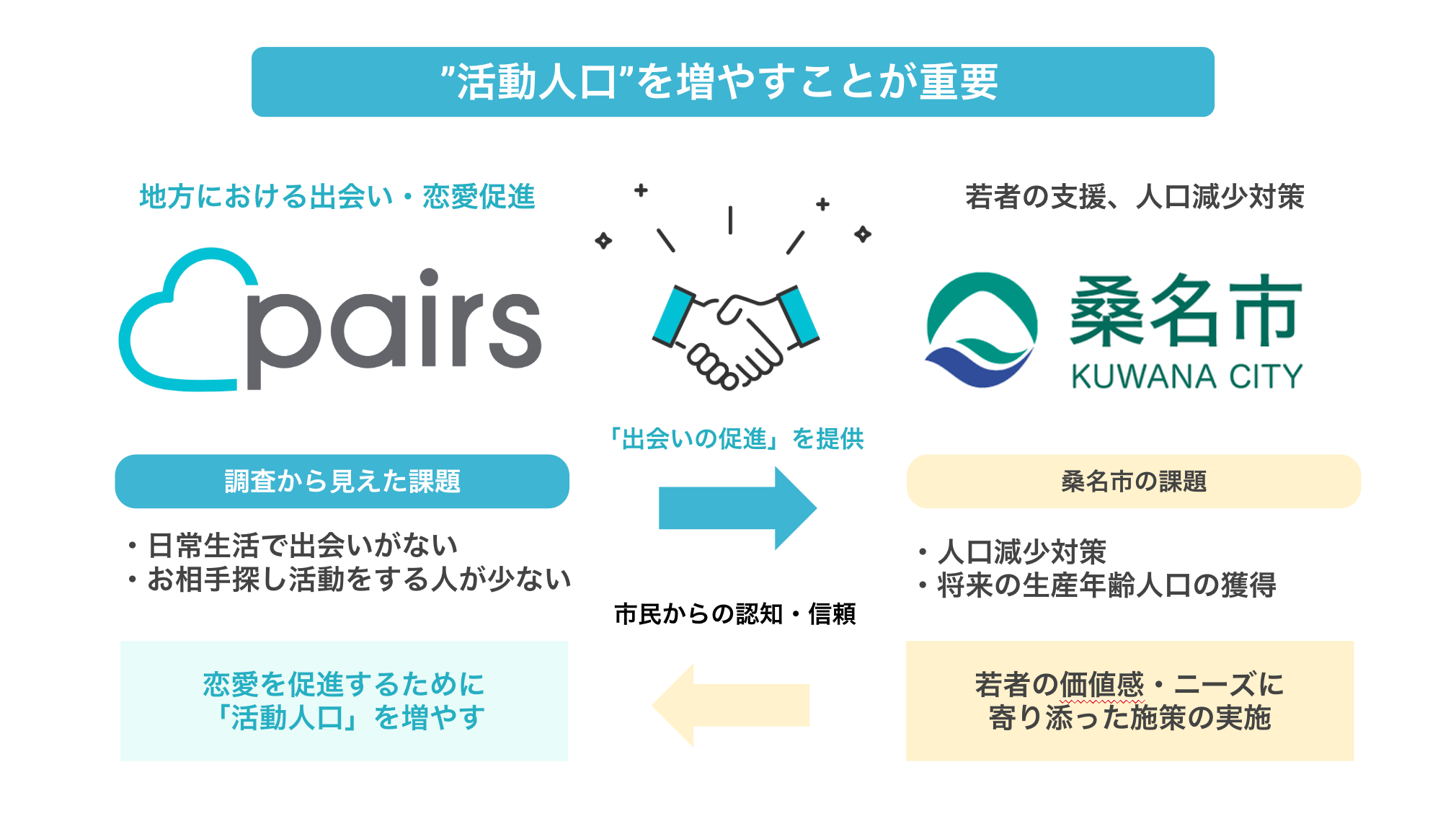 三重県桑名市は、2015年から始まった人口減少に対し「人口減少対策パッケージ」を策定し、流出抑制施策として「若者の考えや気持ちに寄り添った施策」を掲げています。三重県桑名市が抱える人口減少という課題と、ペアーズが目指す出会いや恋愛の促進、ならびに「活動人口」の増加の考えが一致し、2022年11月に「独身男女の出逢いの機会創出等に向けた連携協定」を締結しました。