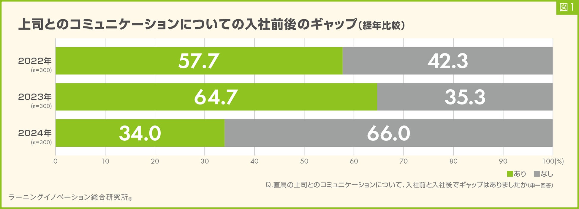 1.“上司とのコミュニケーション”の入社前後のギャップ、「あり」は34.0%。「なし」は66.0%で過去最多