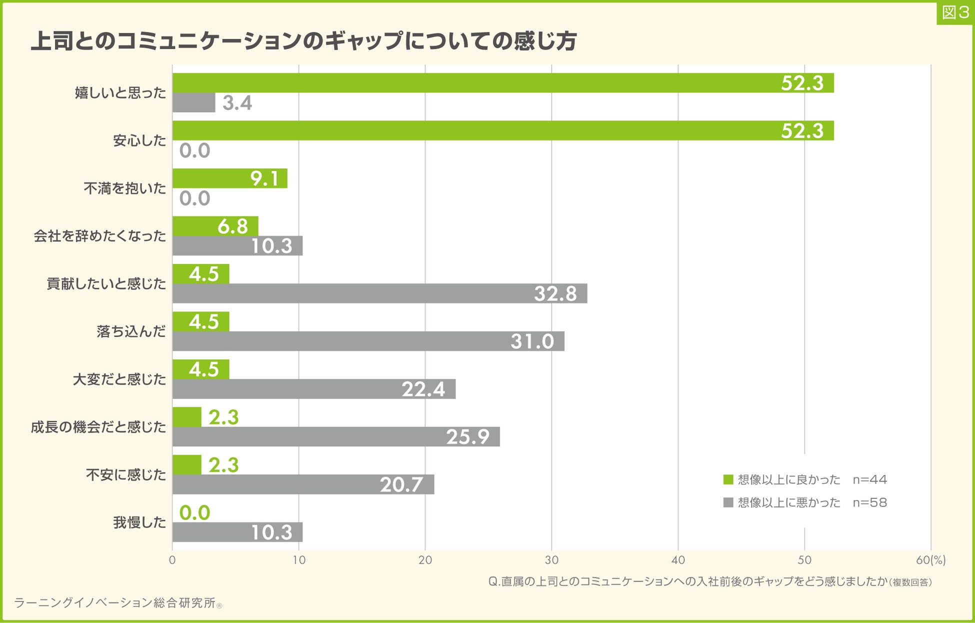 続いて上司とのコミュニケーションについて、入社前後でギャップがあったと回答した人に、そのギャップが想像以上に良かったのか、悪かったのか質問しました。