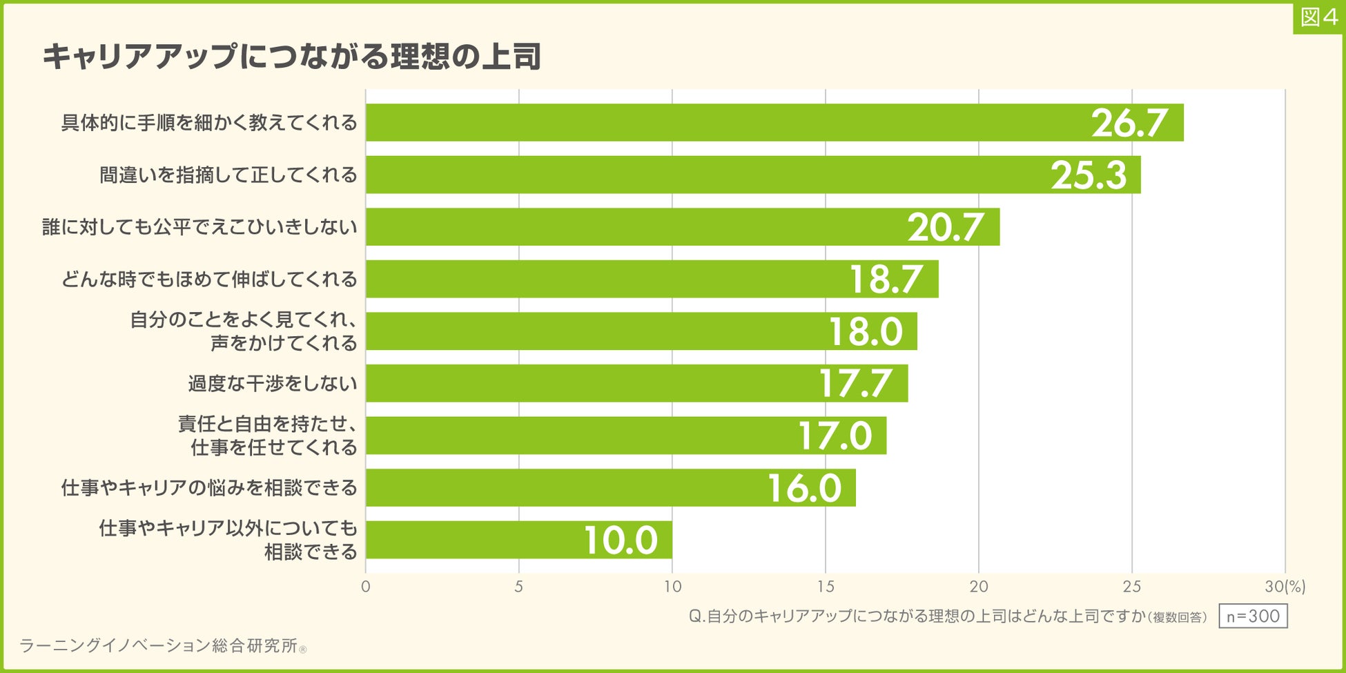 結果、「具体的に手順を細かく教えてくれる」が26.7%で最も高く、続いて「間違いを指摘して正してくれる」が25.3%でした。3位は「誰に対しても公平でえこひいきしない」で、20.7%となりました。(図4)