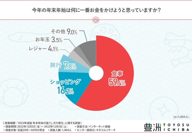 「今年の年末年始は何に一番お金をかけようと思っていますか?」と質問したところ、『食事(59.4%)』と回答した方が最も多く、次いで『ショッピング(16.2%)』『旅行(7.8%)』と続きました。