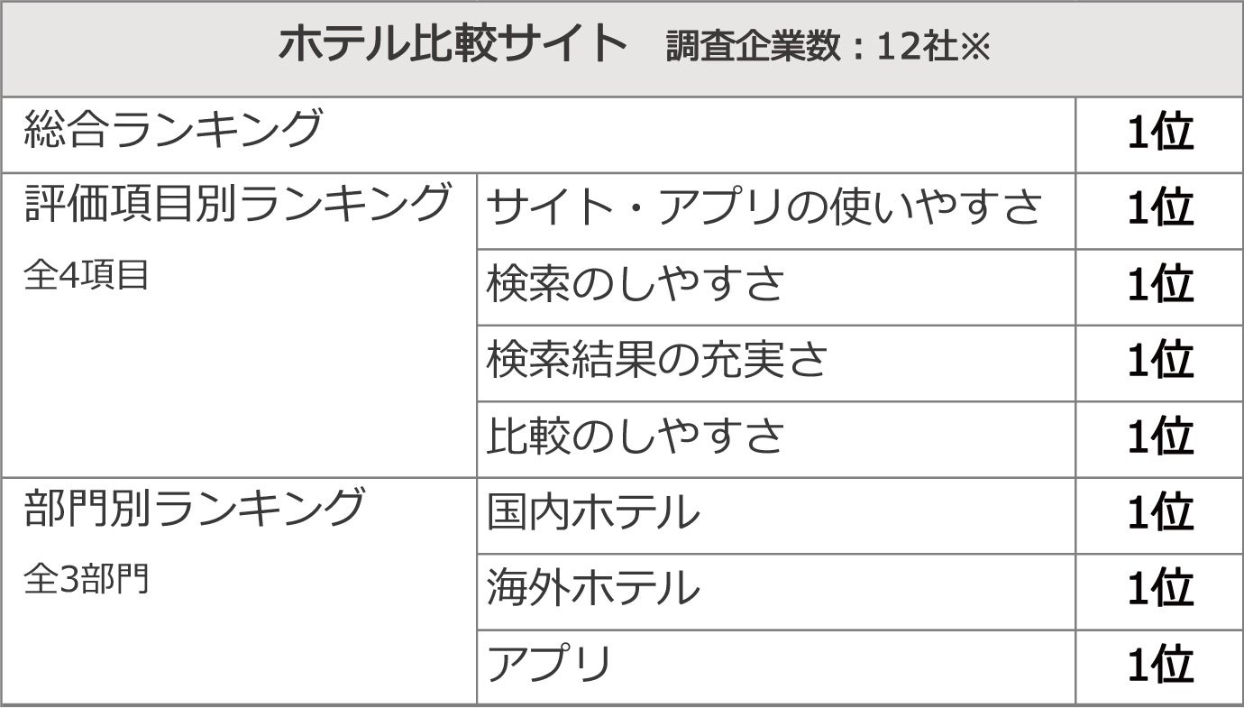 ■定義:複数の旅行予約サイトの商品情報を横断的に検索・比較できる「旅行情報比較サイト」の内、宿泊施設の情報(1泊以上)を取り扱う「ホテル比較サイト」を運営する企業。総合ランキング、及び評価項目別ランキングランクイン条件として、「国内ホテル」、「海外ホテル」どちらの情報も取り扱うサイトを対象とする。なお、国内・海外どちらか1つのみを扱う事業者については、部門別「国内ホテル・海外ホテル」のランクイン対象とする。※キーワード(検索ワード)に対して、旅行予約サイトの商品情報を横断的に検索し、自社サイト内で結果を一括表示するサイト(メタサーチ型)をホテル比較サイトとする。