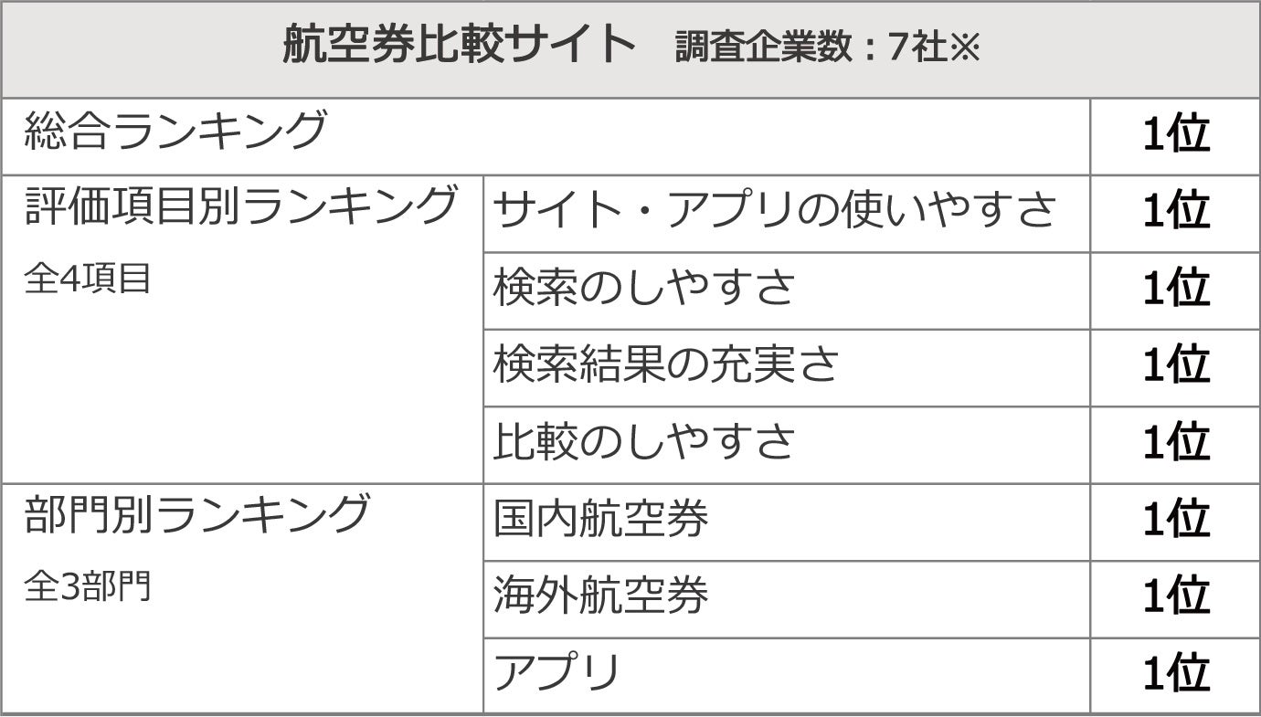 ■定義:複数の旅行予約サイトの商品情報を横断的に検索・比較できる「旅行情報比較サイト」の内、航空券の情報を取り扱う「航空券比較サイト」を運営する企業。総合ランキング、及び評価項目別ランキングランクイン条件として、「国内航空券」、「海外航空券」どちらの情報も取り扱うサイトを対象とする。なお、国内・海外どちらか1つのみを扱う事業者については、部門別「国内航空券・海外航空券」のランクイン対象とする。※キーワード(検索ワード)に対して、旅行予約サイトの商品情報を横断的に検索し、自社サイト内で結果を一括表示するサイト(メタサーチ型)を航空券比較サイトとする。