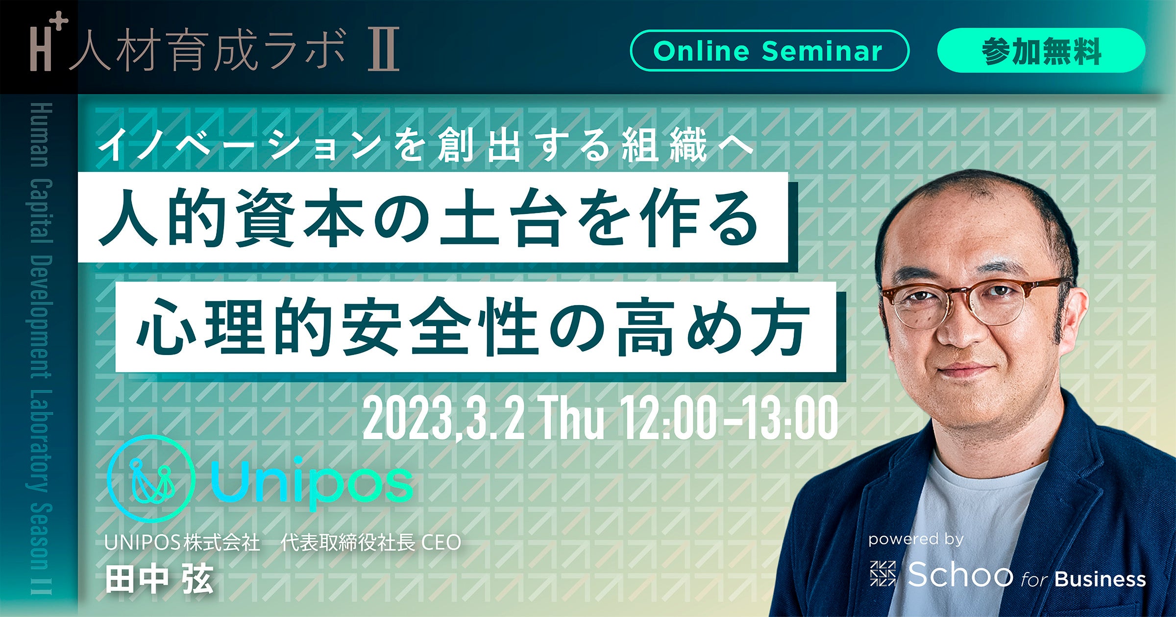 インターネットでの学びや教育を起点とした社会変革を行う株式会社Schoo(本社:東京都渋谷区、代表取締役社長CEO:森 健志郎、以下「スクー」)が提供する法人向け研修サービス「Schoo for Business」は、人的資本経営や組織開発に関連する情報発信やイベントを開催する「人材育成ラボ(H+)」を運営しています。この度3月2日(木)に、Unipos株式会社の代表取締役社長CEO 田中 弦氏をお迎えし、人的資本経営の土台となる心理的安全性の作り方を解説いただくウェビナーを開催します。参加費は無料です。