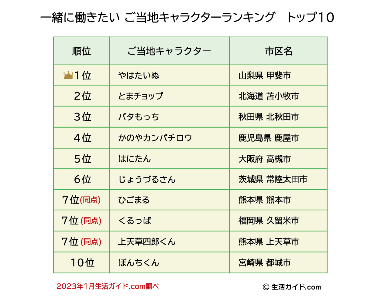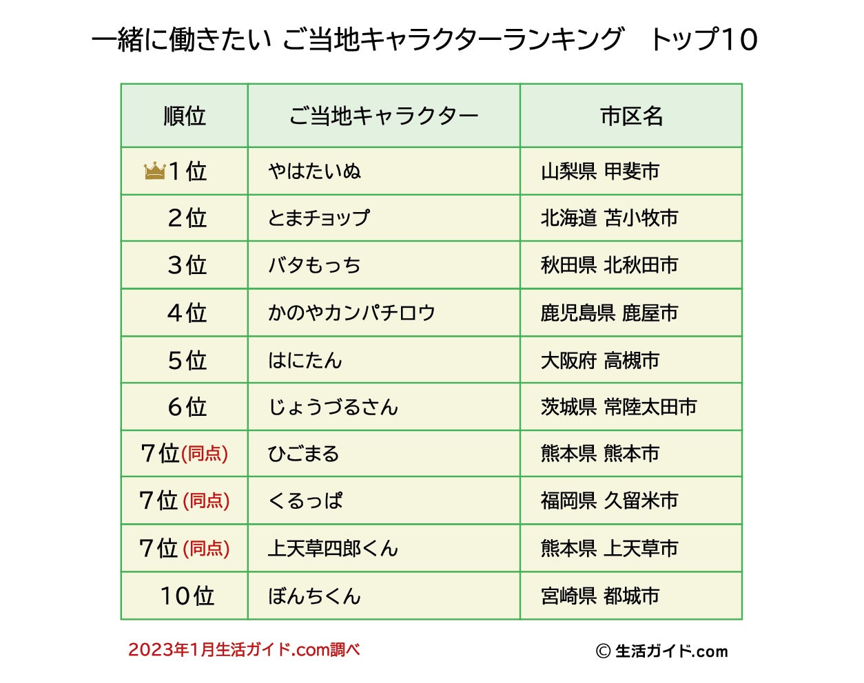 「役職」をもらって日々お仕事をしているご当地キャラクターを生活ガイド.comが厳選し、「一緒に働きたい!」と思うご当地キャラクターを生活ガイド.com会員に投票いただき、ランキングにしました。