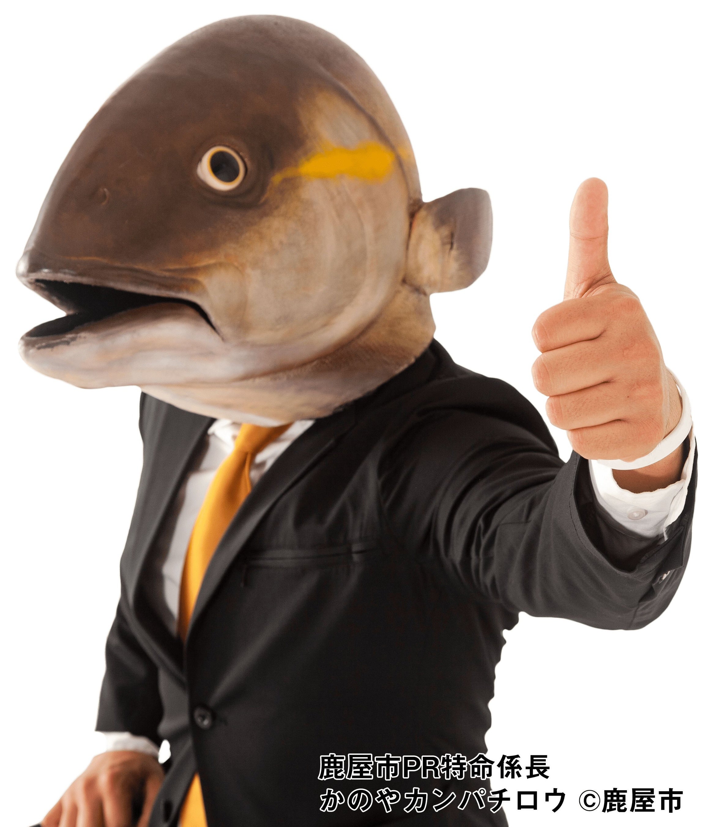 かのやカンパチロウは、26歳オス(独身)、身長176cm、体重68kg、鹿屋市古江沖出身のうお座です。特徴は、スーツにネクタイ、革靴でビシッと決めた「かのやカンパチ」の半魚人で、かのやカンパチPRソング「COME ON!PARTY!かのやカンパチ!」に合わせたキレッキレのダンスは必見です。通称「カンパチダンス」を武器に、日夜仲間(カンパチ)を売り込む活動に勤しんでいます。