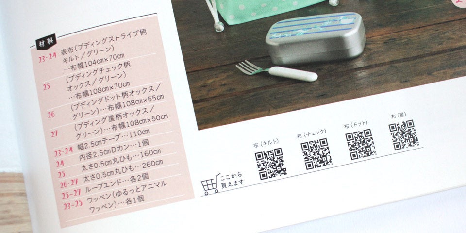 作品に使われている生地や副資材などの材料は、全国のクラフトグループ店舗(※)および公式オンラインショップで取り扱っています。紙面に掲載されている二次元コードを読み取れば、オンラインショップの商品ページにつながりますので、簡単に作りたい作品の材料を手にしていただけます。