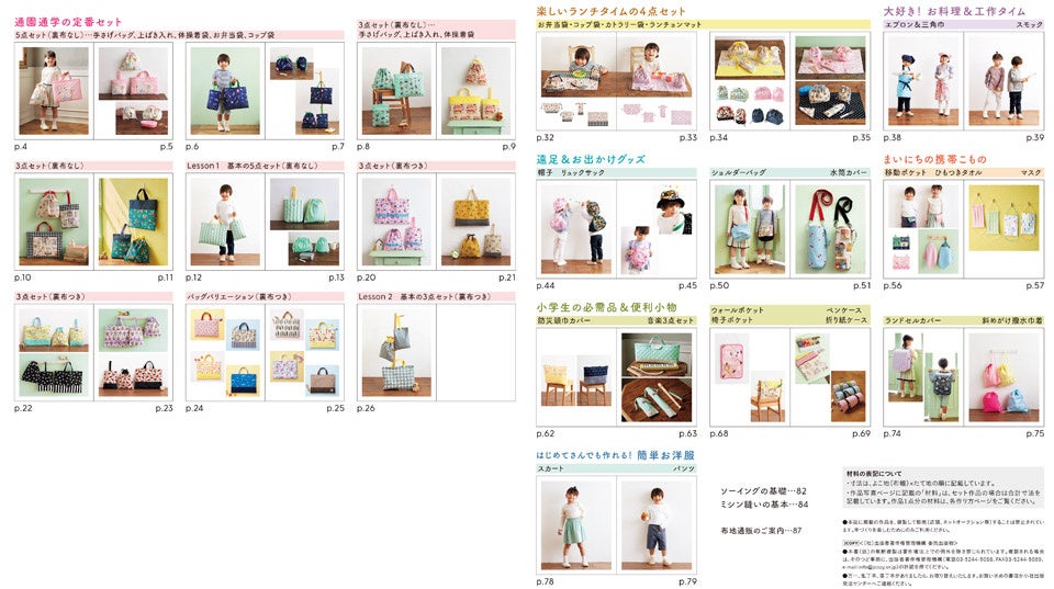 通園通学の必需品である手さげバッグ・上ばき入れ・体操着袋・コップ袋・お弁当袋などから、幼稚園・保育園・小学校で必要となるエプロンやスモック、音楽セット、防災ずきんカバーまで様々なグッズを計123点掲載。作品の色柄バリエーションも豊富になっていますし、作品のアレンジ方法などもご紹介しています。