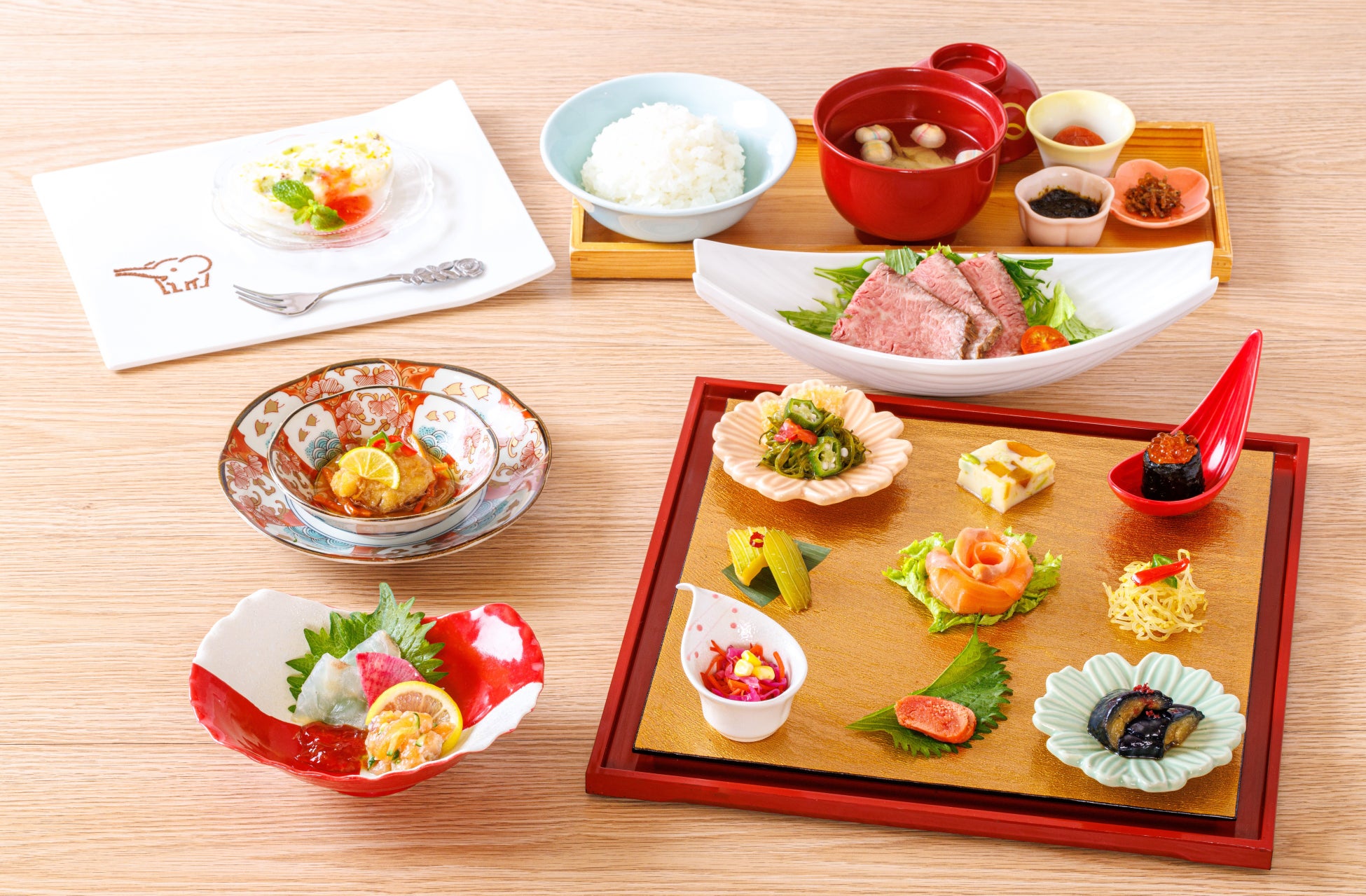 前菜9種ちょっと盛りをはじめ、2種の刺身、はもの南蛮漬け、和牛ロースのローストビーフなど、華やかな創作料理をご用意しました。はものふんわりとした身と上品な旨みを活かした南蛮漬けは、暑い夏でもお箸がすすみます。また、夏姫会席でしか味わえないぞうさんデザート~米粉と桃のフローズンケーキ~は、桃の甘みと、ひんやりとした口どけが夏の暑さを忘れさせる見た目にも爽やかなデザートです。