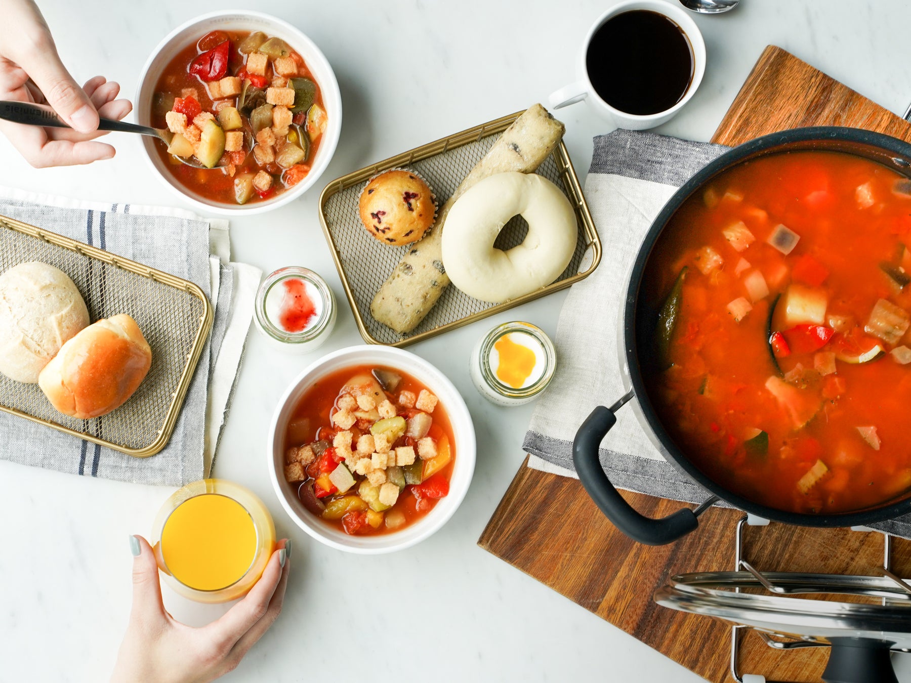 【内容】日替わりスープ(ミネストローネ、クラムチャウダー、マッシュルームスープなど)、パン(2種)※3つめからは追加料金100円、ヨーグルト、フルーツジュース ※季節や仕入れ状況により内容は異なる場合がございます。