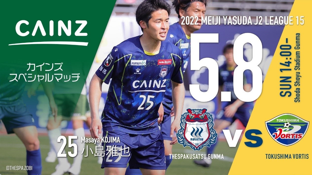 今シーズンのザスパは大槻新監督のもと、明治安田生命J2リーグ第12節を終えて5勝5敗2分け(4/28現在)と上位争いを繰り広げています。今年の「カインズスペシャルマッチ」は第15節にあたり、大型連休最終日の5月8日(日)14時、ホームの正田醤油スタジアム群馬でキックオフ。対戦相手は、徳島ヴォルティスです。