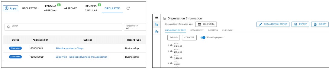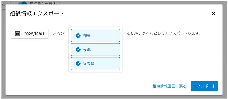 指定した時点の組織情報をCSV形式で出力、入力機能を追加しました。大規模な組織において、これまで手動での作成や更新が困難だった部署・従業員情報の管理を大幅に効率化します。この機能は、新規に組織情報を作成する際や、年度替わりなどに発生する大規模な組織変更時の更新、またバックアップや他システムへのデータ連携などにご活用いただけます。