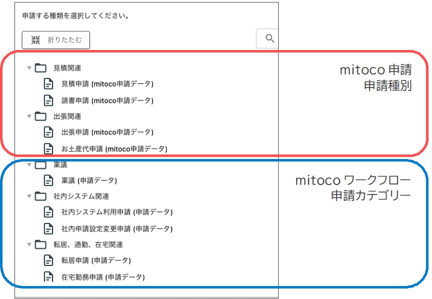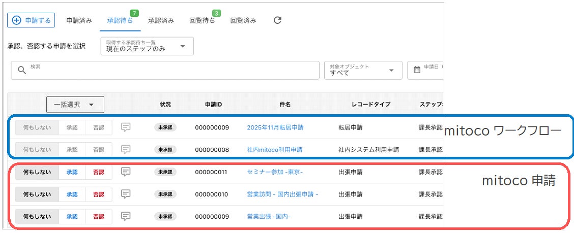 今回のアップデートにより、[mitoco申請]タブの申請ツリーで、mitocoワークフローの申請を選択できるようになります。また、[mitoco申請レコード一覧]にもmitocoワークフローでの申請が表示されるようになり、対象を絞りながら移行できるようになりました。