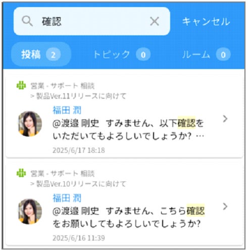 ルーム名やトピック名、フィードの投稿を対象に、目的の情報を一括で検索できるようになりました。探したい情報がどのルームにあるかなどすぐに見つけ出せるようになりました。