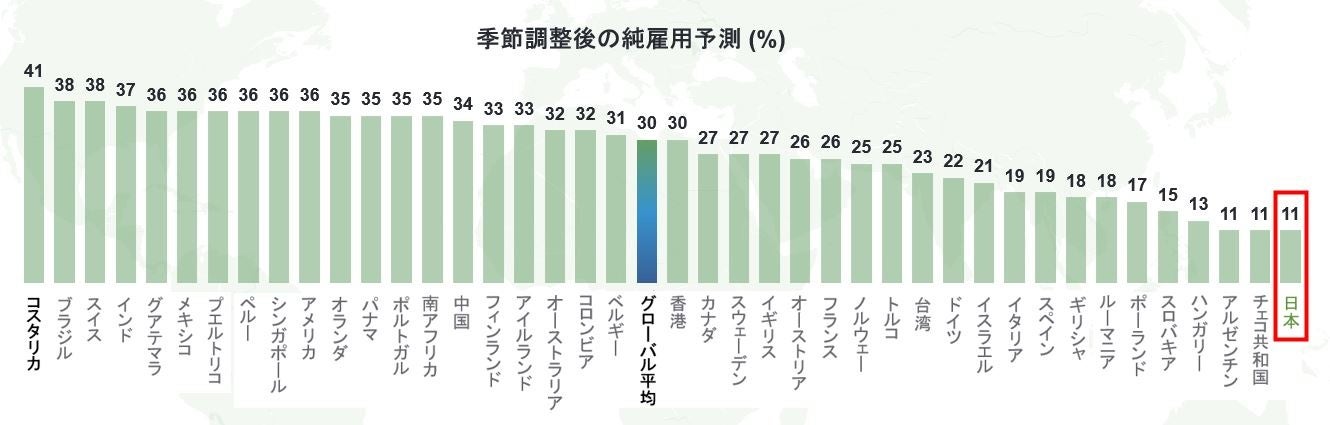 41カ国・地域すべてで、純雇用予測は、プラスと回答しています。日本は、アルゼンチン・チェコ共和国と並び、世界比較で最も低い雇用意欲の結果になりました。