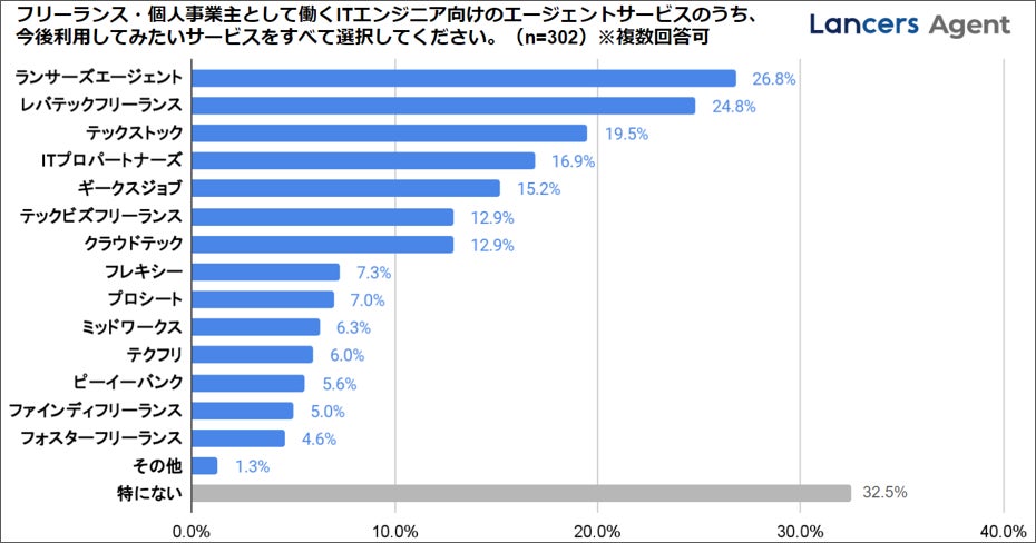 ITエンジニアに今後利用してみたいエージェントサービスを伺ったところ、『Lancers Agent(ランサーズエージェント)』がトップという結果だった。