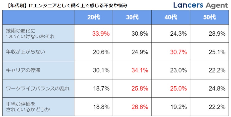 年代別に見ると、20代の若い世代が「技術の進化についていけないおそれ」を強く感じており、30代は「キャリアの停滞」や「正当な評価をされているかどうか」といったキャリアに関する不安を抱えていることがわかった。40代は、「年収が上がらない」「ワークライフバランスの乱れ」といった生活に直結する課題に悩みがあることがうかがえる。