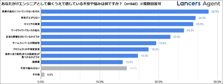20~30代のITエンジニアは、「技術の進化についていけないこと」に不安を感じており、情報のキャッチアップや自身のスキルアップに課題があると考えていることが見受けられる。