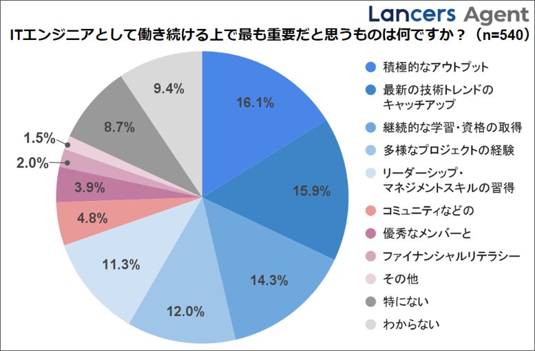 「ITエンジニアとして働き続ける上で最も重要だと思うもの」として、「積極的なアウトプット(16.1%)」「最新技術のキャッチアップ(15.9%)」「継続的な学習・資格の取得(14.3%)」が上位3つに挙がった。これらの項目はいずれも技術を取得して高い成果を出すために重要であり、スキルアップに対する高い意識が見受けられる。
