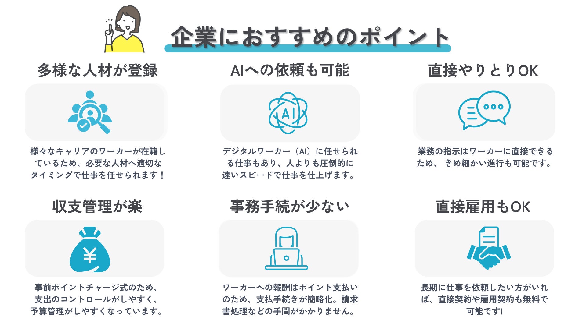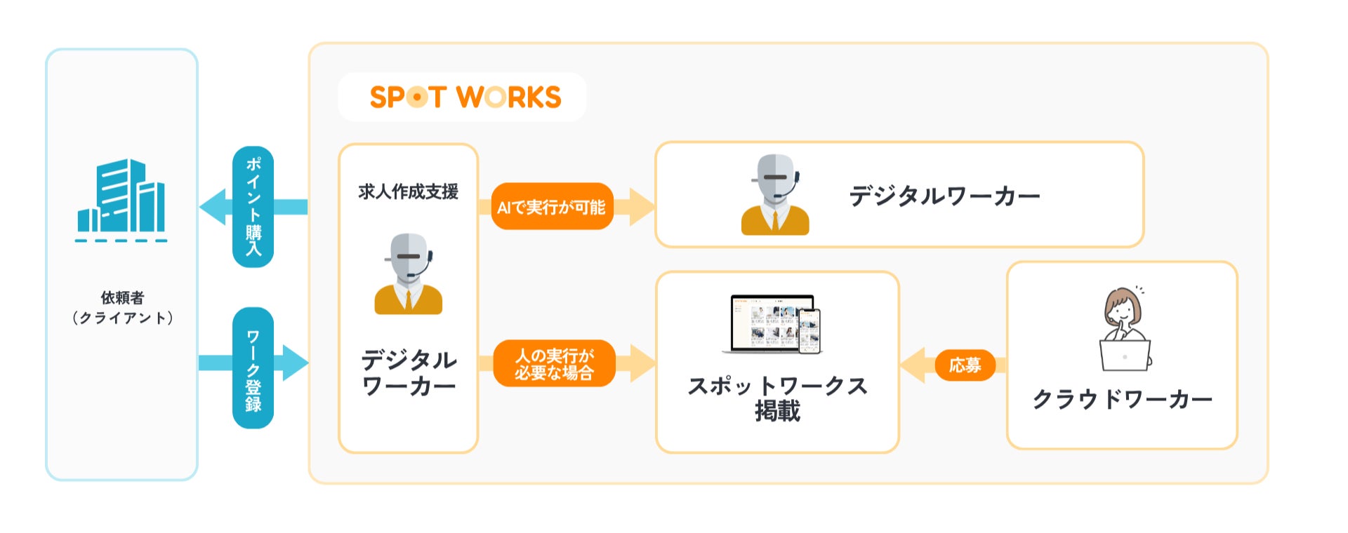 「スポットワークス」は、短時間業務を行いたいクラウドワーカーと、限られた社内リソースで効率的に業務を遂行したい企業を結ぶ、クラウドソーシングサイトです。実際の業務も遂行できるAI「デジタルワーカー」を導入しており、求人情報の作成支援に加えて、AIが実行可能な業務はデジタルワーカーが対応し、人の手が必要な業務のみをクラウドワーカーに依頼できる仕組みを整えています。