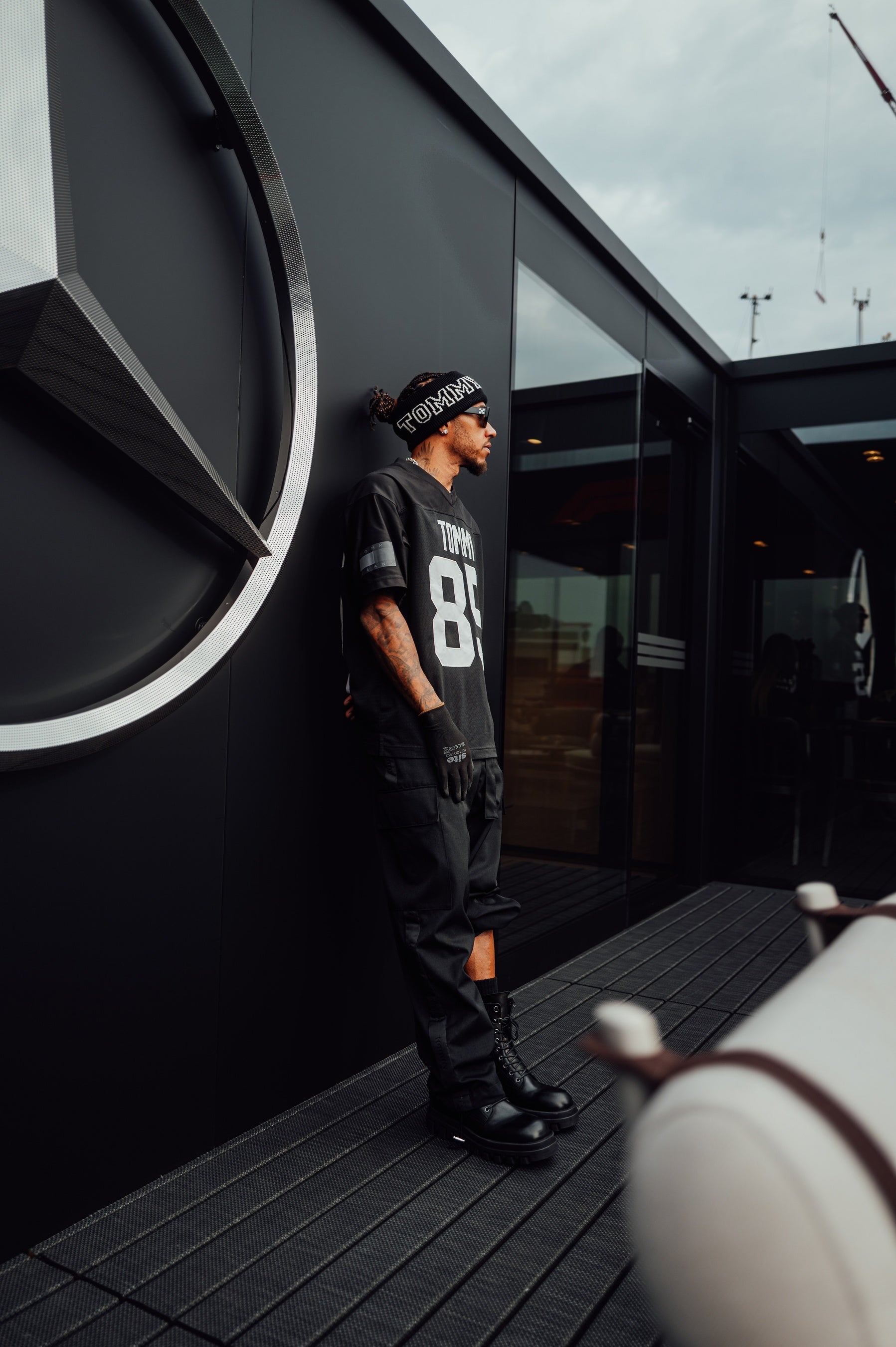 ルイス・ハミルトンは、11月に発売予定のTOMMY JEANS Remastered(トミー ジーンズ リマスタード)コレクションから、ヴィンテージウォッシュ加工が施されたリラックスフィットのプレミアムTシャツ、2023年秋のトミー コレクション バイ トミー ジーンズからワイドフィットのカーゴパンツ、そしてブラックのコットンのヘッドバンドを着用しています。