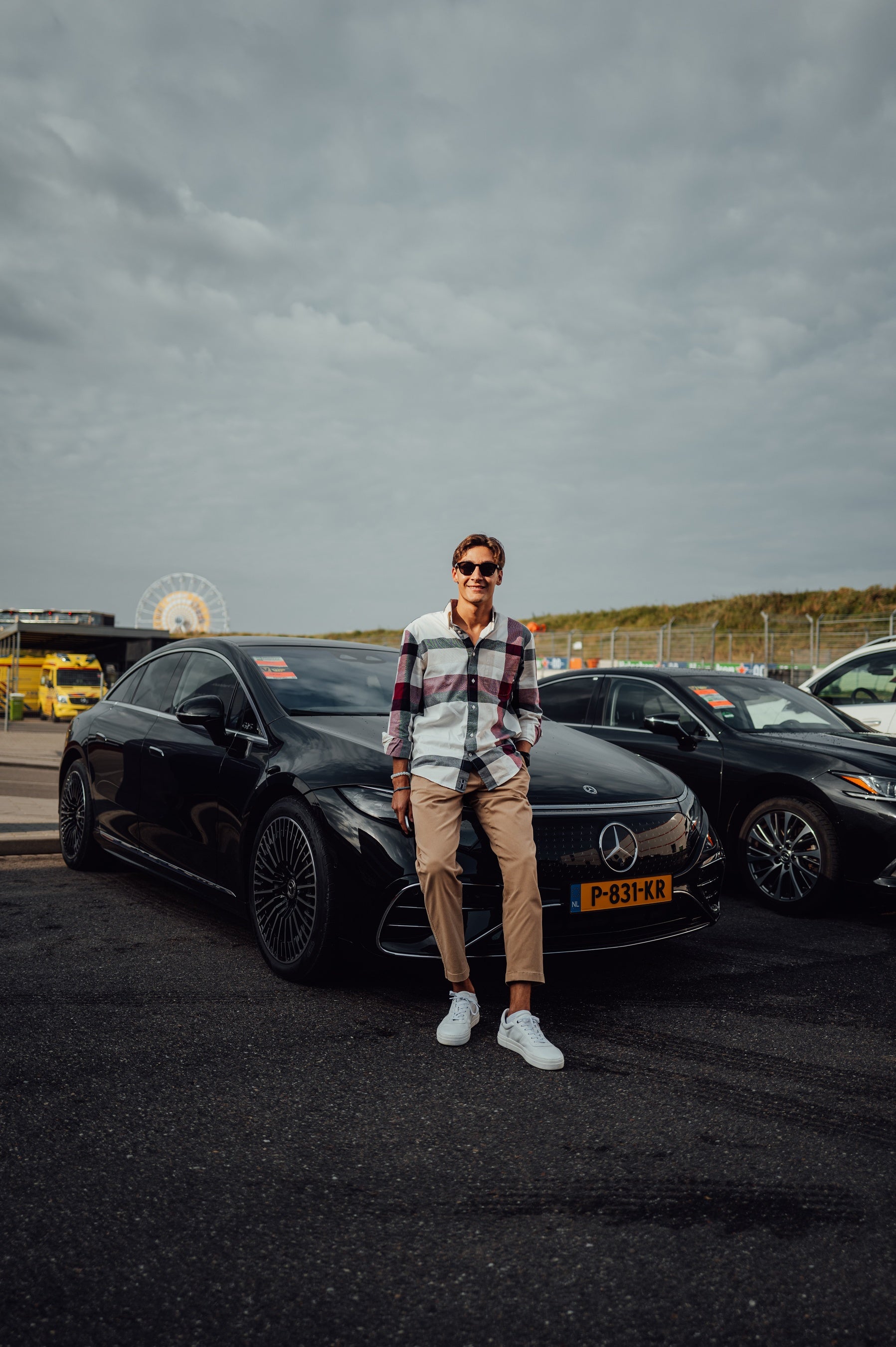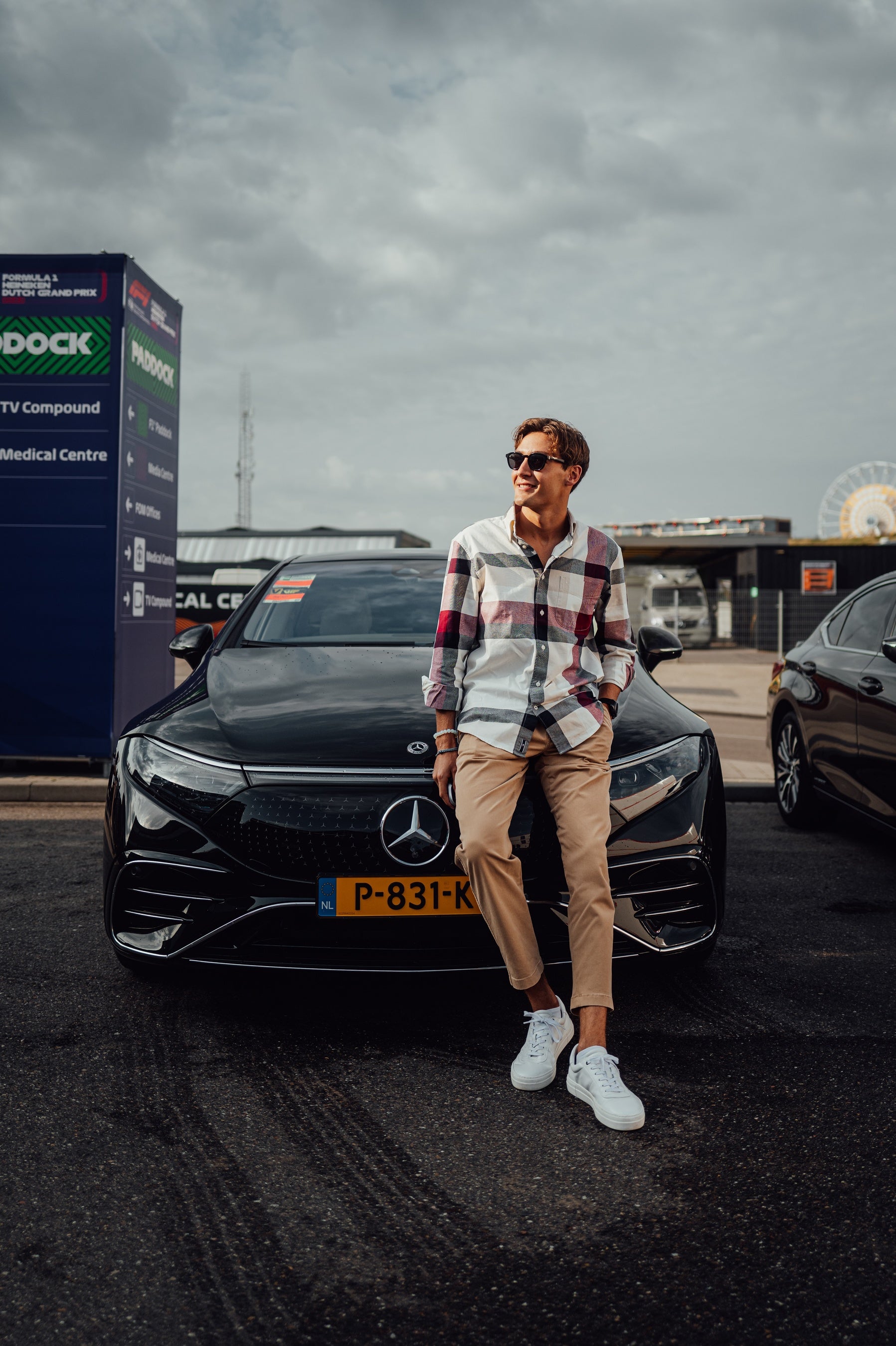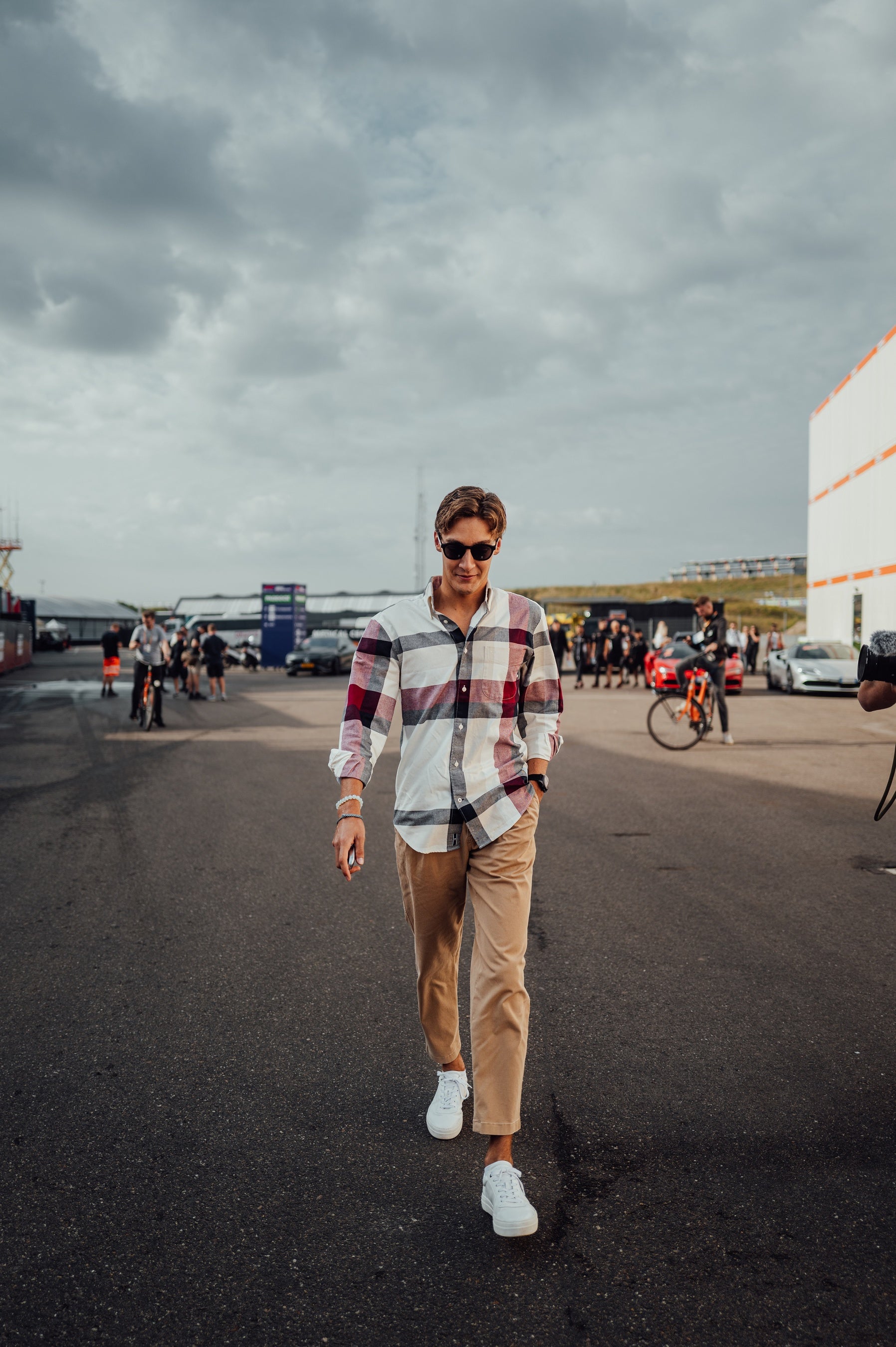ジョージ・ラッセルは2023年プレフォールコレクションのグローバルストライプチェックシャツとテーパードハンプトンフィットのチノパンツを着用しています。