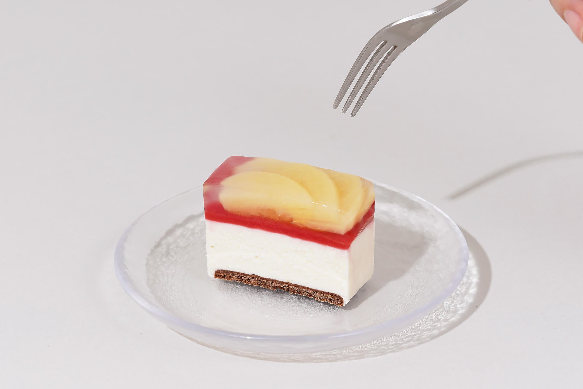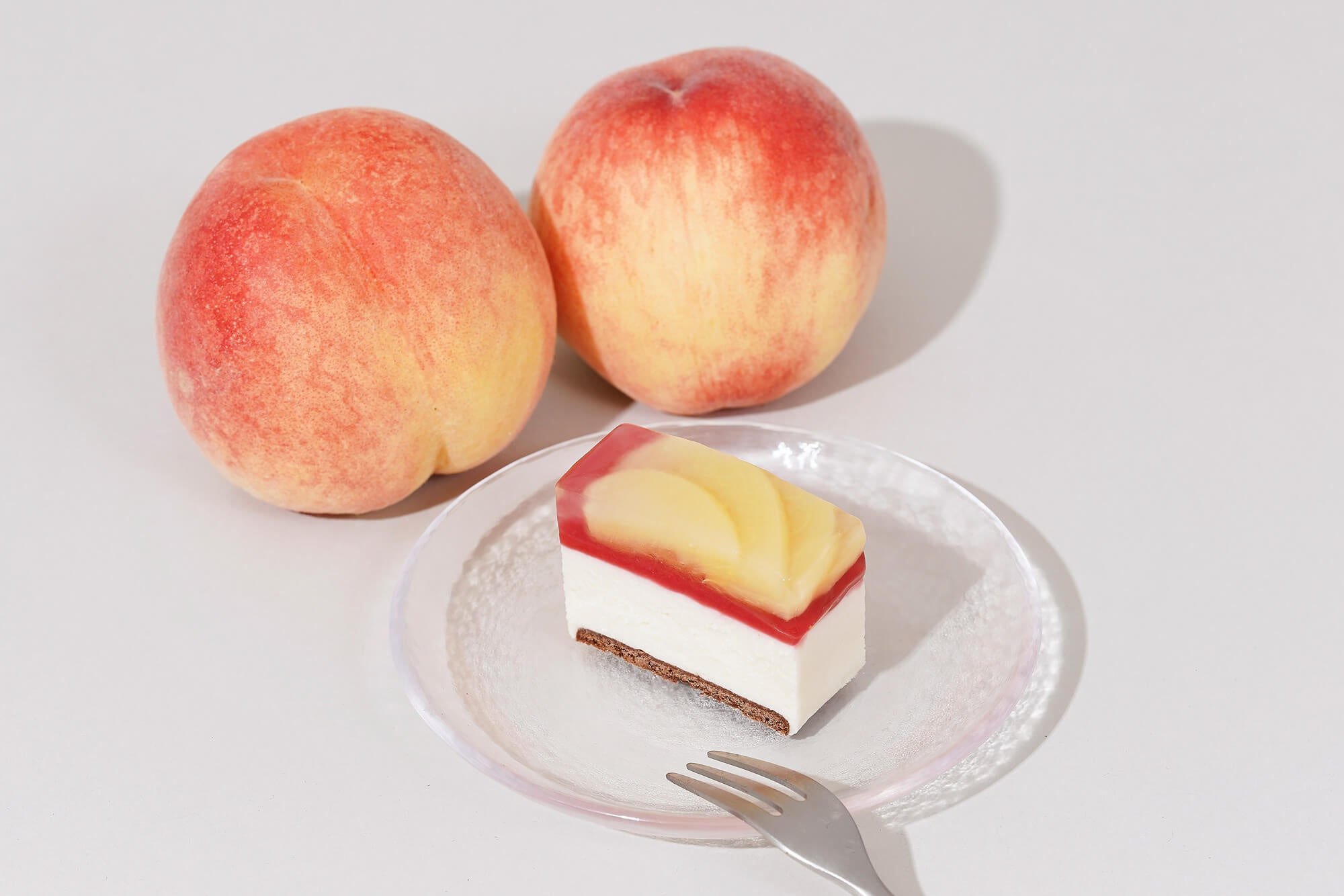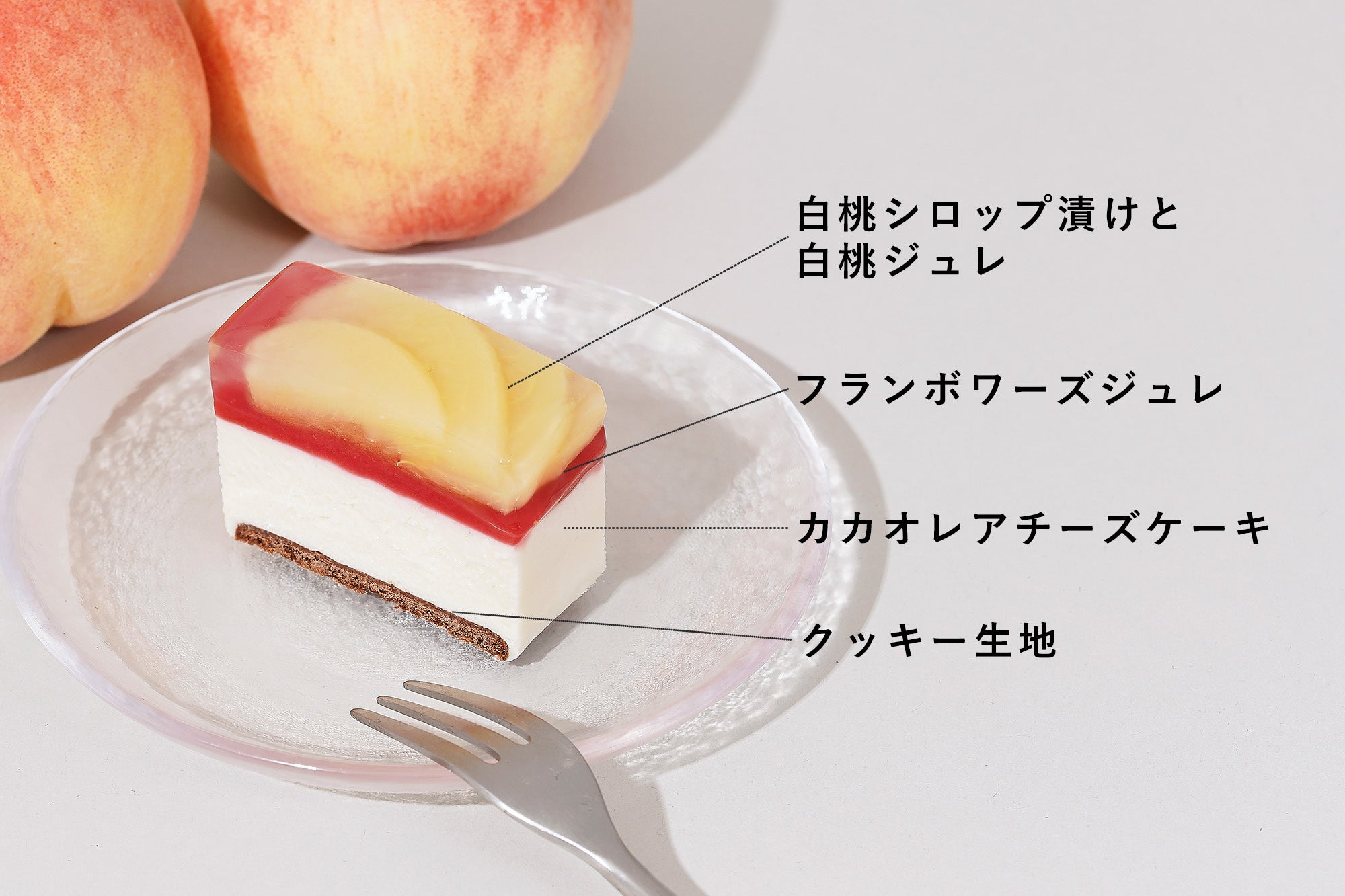 ・カカオの果肉を使った爽やかなレアチーズケーキと桃のハーモニー