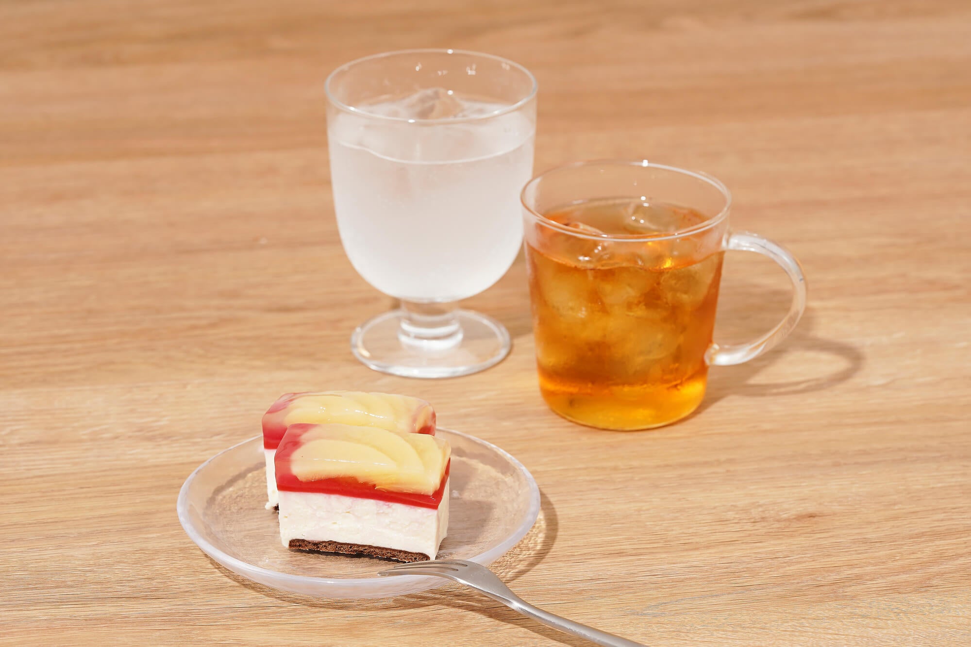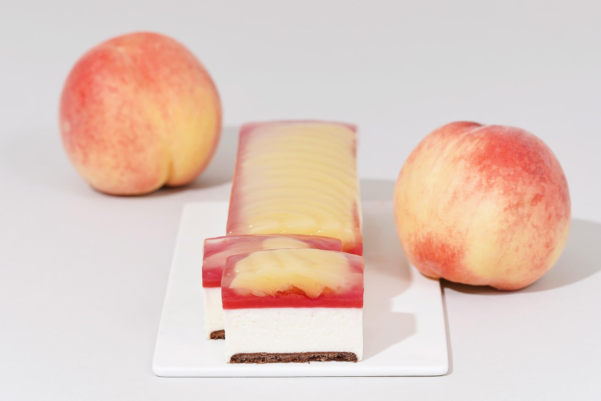 トップにはスライスした白桃のシロップ漬けを、白桃シロップ・白ワイン・レモン果汁を加えたジュレで包み込みました。