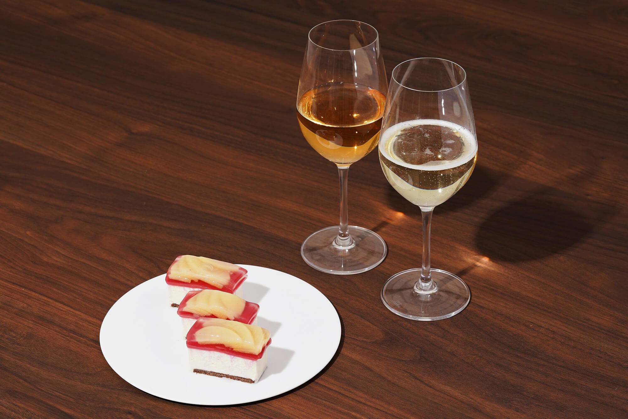 その下には、フランボワーズの酸味を効かせたジュレを用いており、ヴィヴィットな色合いも見た目のアクセントになっています。