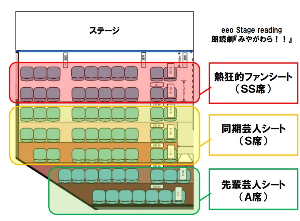 座席は実際の劇場にならい、「熱狂的ファンシート(SS席)」「同期芸人シート(S席)」「先輩芸人シート(A席)」の3種類に分かれており、リアルな劇場を再現した公演になっています。