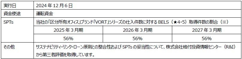 当社が展開する「VORT®」シリーズおよび管理物件は、都心5区を中心に190棟を超えており(2024年10月末時点)、建築物省エネルギー性能表示制度 BELS認証(Building-Housing Energy-efficiency Labeling System)を取得した実績は69棟(2024年11月現在)に上っています。優れた環境性能を有する不動産の形成により、CO2排出量の削減等、環境や社会への配慮に努めておりますが、より環境保全に貢献すべく、このたびの「114サステナビリティ・リンク・ローン」において、当社は「VORT」シリーズの仕入件数に対するBELS(★4・5)取得件数の割合をSPTsとし、下記のように目標を設定しました。
