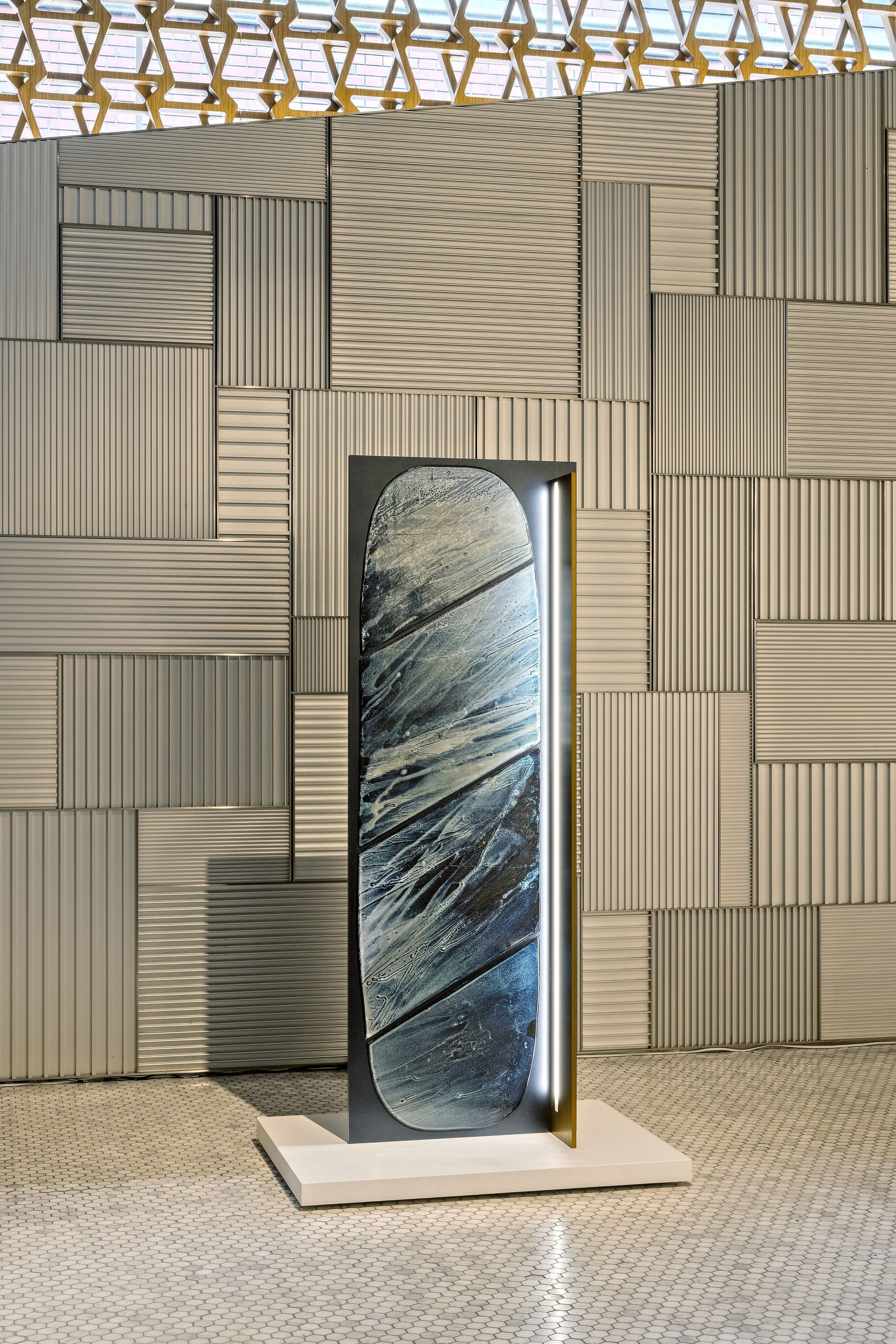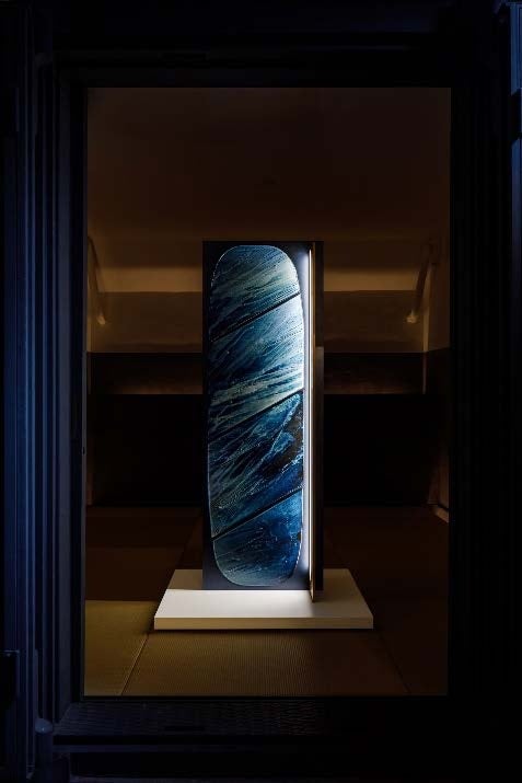 東北最古の窯場といわれる会津本郷焼の陶器を、モノリスのような造形に埋め込んだフロアライト。⼤判の陶板を、降り頻る⾬を思わせる様な独特の釉薬の表情をそのまま⽣かし、焼成した。⼿作り、かつ焼成後に縮みや反りが⽣じる陶器を、異種素材と組み合わせるために、焼き上がった陶板をスキャンしてデジタルデータとして取り込み、それに合わせて樹脂と⾦属素材を切削加⼯することで、この構成を実現した。