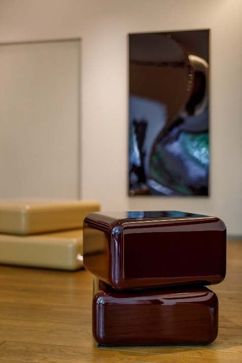 丸みを帯びたボリュームのある2種のテーブルと、なだらかなカーブの稜線が特徴的な壁掛け作品による川連漆器のシリーズ。光と素材の相互作⽤に常にインスピレーションを受けてきたデザイナーらしく、漆の特性を活かし、その表⾯に捉えられた光を巧みに操り、⾒る者をあらゆる⾓度から探求へと誘う。多少のひねりやアクセントを加えつつも、無駄をそぎ落とし本質を残すことで、漆器そのものに焦点を当てた作品。