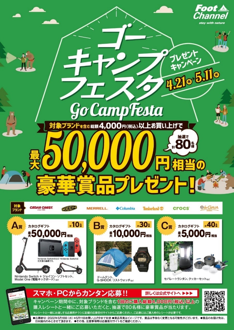 最大50,000円相当の豪華賞品が当たる「Go Camp Festa ~ゴー キャンプ フェスタ~」4月21日(木)から、全国のシュープラザ、公式オンラインショップ「kutsu.com」で開催