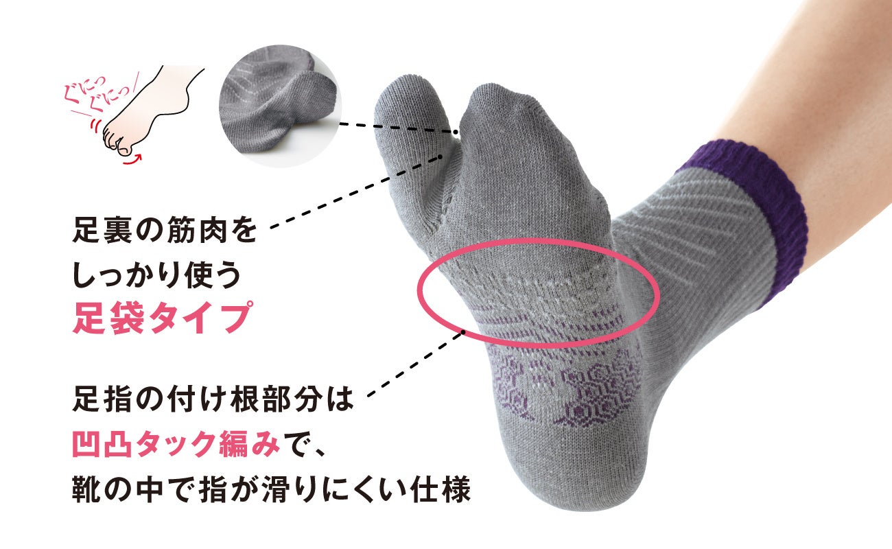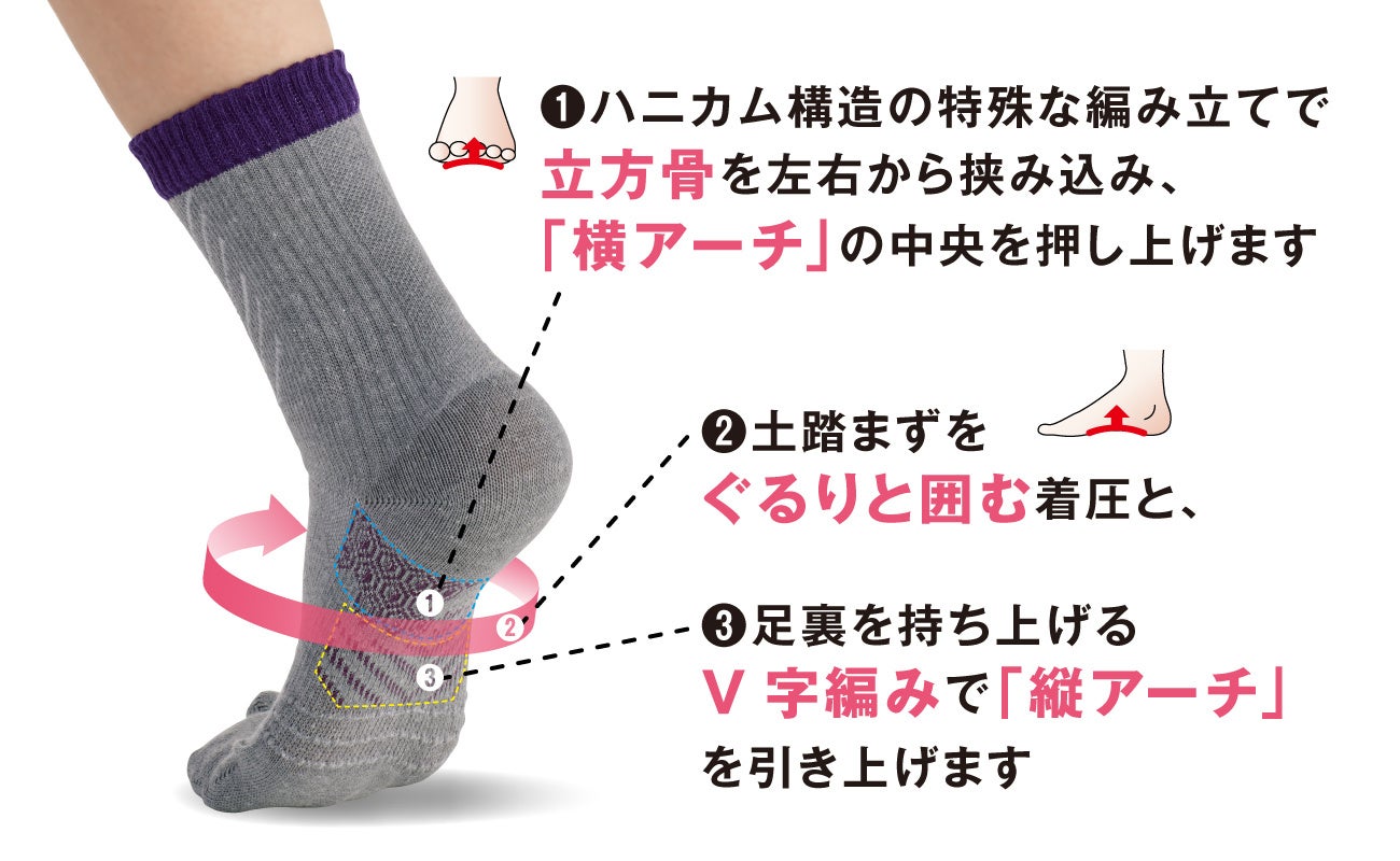 鍼灸師・柔道整復師の松村先生と共同開発、独自のサポート設計をした靴下。ハニカム構造の特殊な編み立てで、履くだけで土踏まず部分を中央に押し上げます。また、親指部分が独立した足袋状の設計で、素足のように自然な力が入れやすくなっています。日常動作の中で、気軽に筋力維持※につなげることができます。