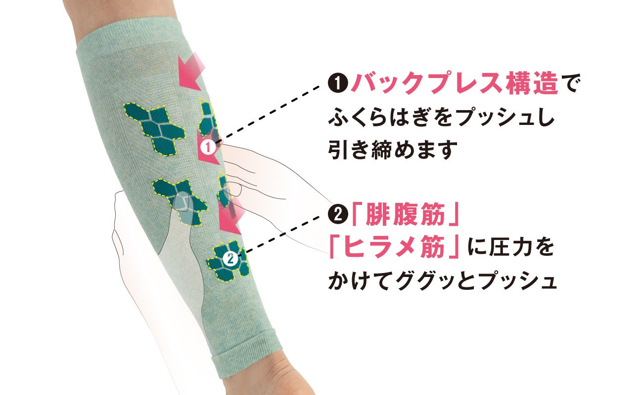 こちらも鍼灸師・柔道整復師の松村先生と共同開発した、ふくらはぎ専用のサポーター。「筋肉の引き締めと押し上げ」をコンセプトに、従来の段階着圧設計に加えて、特許取得の「バックプレス製法」を使用。更にふくらはぎの要となる腓腹筋、ヒラメ筋を効率的にググッとプッシュする独自のトリプル着圧設計。職人技術を駆使したオリジナルの編地設計です。
