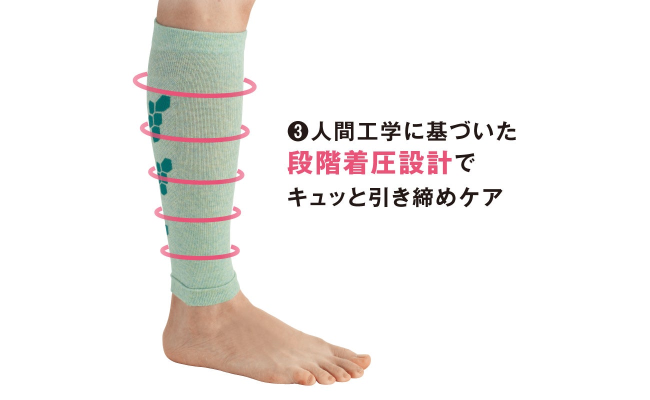 開発にあたっては、鍼灸師・柔道整復師の松村正隆先生を専門家としてお招きし、同時に社内モニター会や外部研究機関としてユニチカガーメンテック(株)での機能テストを経るなどして約1年かけて進行。また上月はじめ、アラフィフの商品プランナーを中心に、お客様と同世代のスタッフが“自分ごと化”して企画開発しています。近頃何もないところでよくつまずく、階段がキツイ、座りっぱなしがつらいなどでお悩みの女性に向けて、365日、日常生活の中で気軽に続けられる足腰のケアや筋力アップのアイテムをご紹介します。