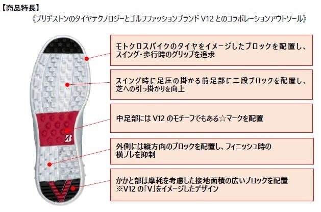 同商品は、「V12」監修の下、アッパーのサイド面には型押しのロゴ、踵部分にはスタッズをイメージしたデザインなど、カジュアルテイストな仕上がりになっています。そして、高いグリップ性能を誇るアウトソールを前作から継続採用し、安定したグリップ力を維持しています。また、前モデルでご好評いただいたレディスサイズ※1についても3サイズ展開いたします。