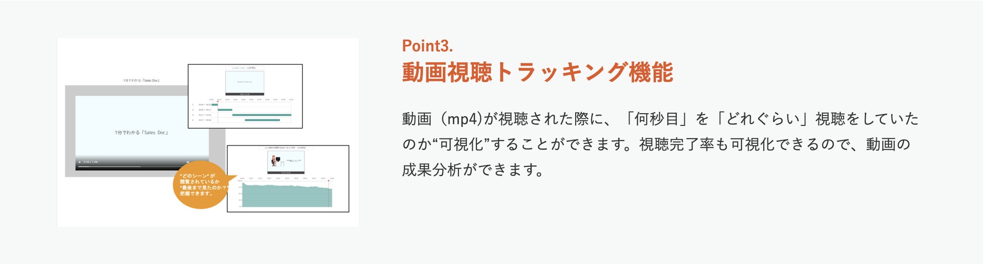 「Sales Docコクリポ限定プラン」のアカウントにて、ウェビナーやプレゼンの動画ファイルをアップロードいただければそれをオンデマンドで配信でき、その動画を、誰がどのようにどれくらい視聴したのか分析できるようになります。