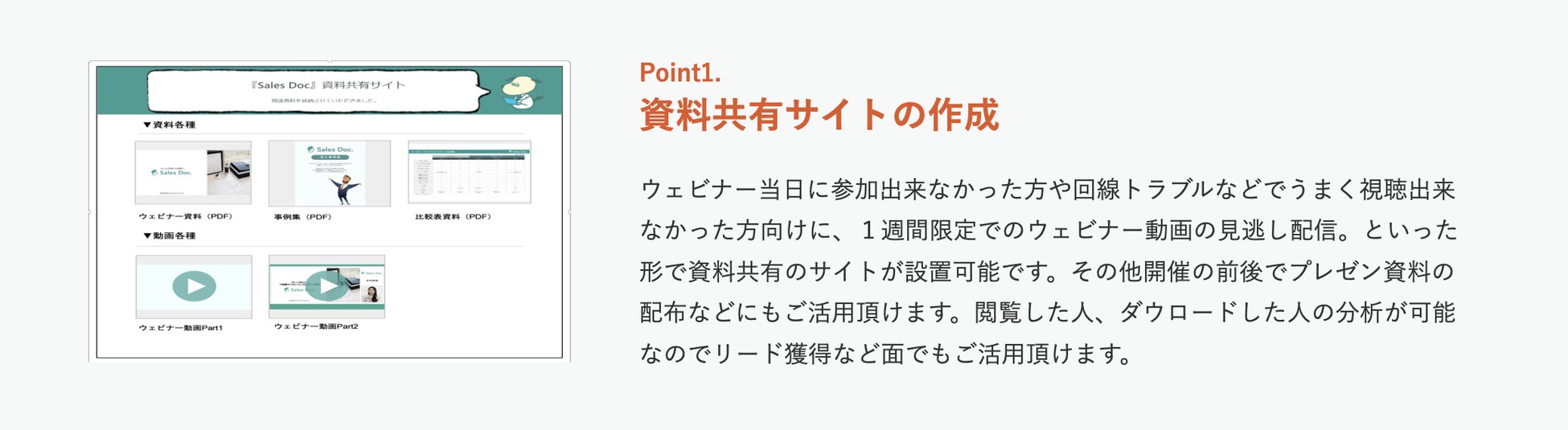 コクリポではこの度、そういった企業様のニーズにお応えするべく、コクリポの有料プラン(ビジネスプラン・エンタープライズプラン)ご利用時には当社が販売している営業用顧客分析ツールSales Docの「Sales Docコクリポ限定プラン」を無料でご利用いただき、ウェビナー動画のアーカイブ・オンデマンド配信・ユーザーの視聴データ分析を可能にいたしました。