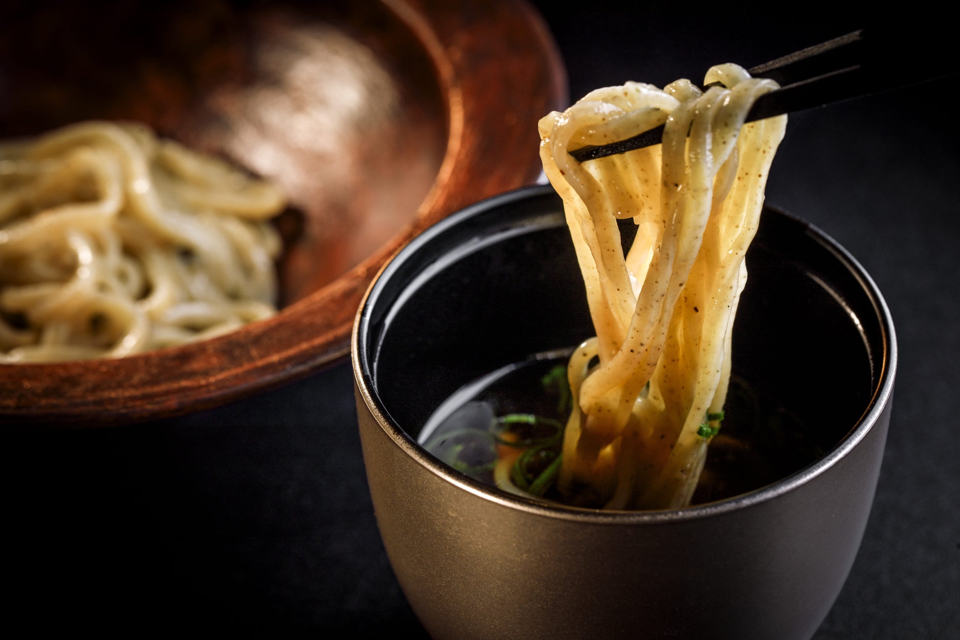 コンソメをベースに自家製の「かえし」で味付けしたつけ汁が旨味抜群のつけ麺。吉野葛を加えてとろみをだしているので麺なじみがいいのも特徴。食べ終わった後はつけ汁に牛骨スープを入れ、最後までお楽しみください。
