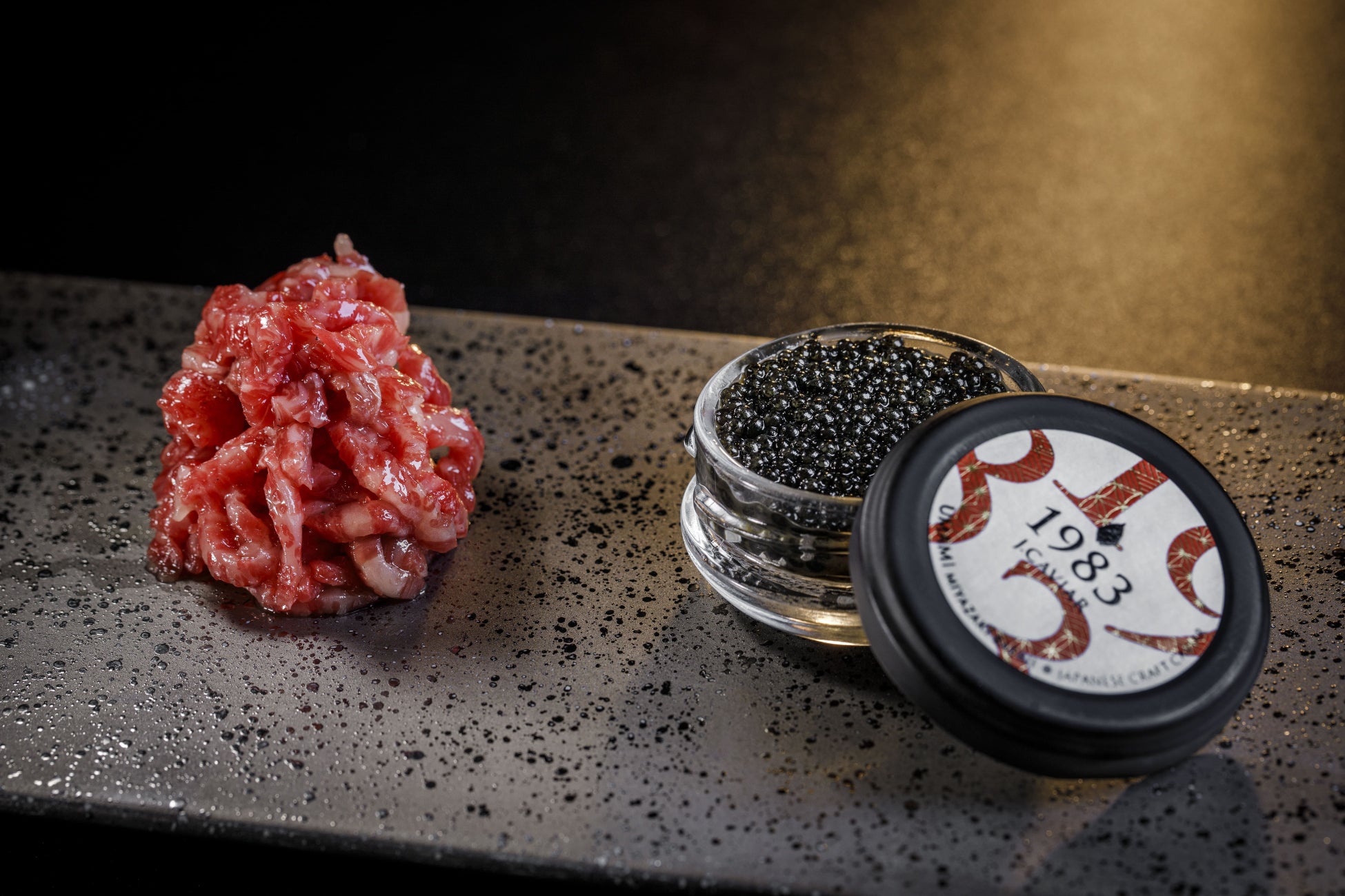 国産のシベリアチョウザメを和⾵⾵味に仕上げたという珍しいキャビアを一人一瓶ご用意いたします。キャビアを昆布、醤油、岩塩で味付けし、熟成したという上品で奥行きのある味わいは感動モノ!キャビアの程よい粒感はねっとりとした舌触りの但馬玄ユッケとも好相性です!
