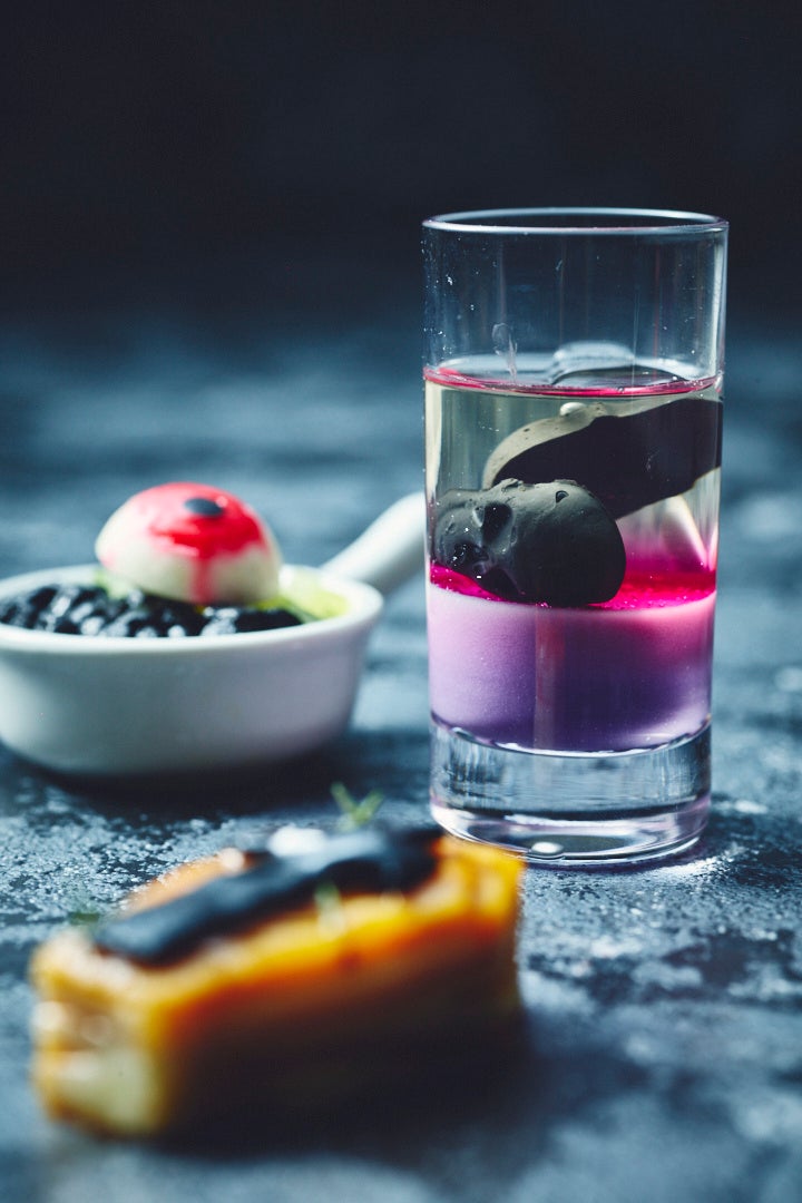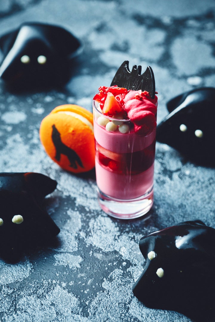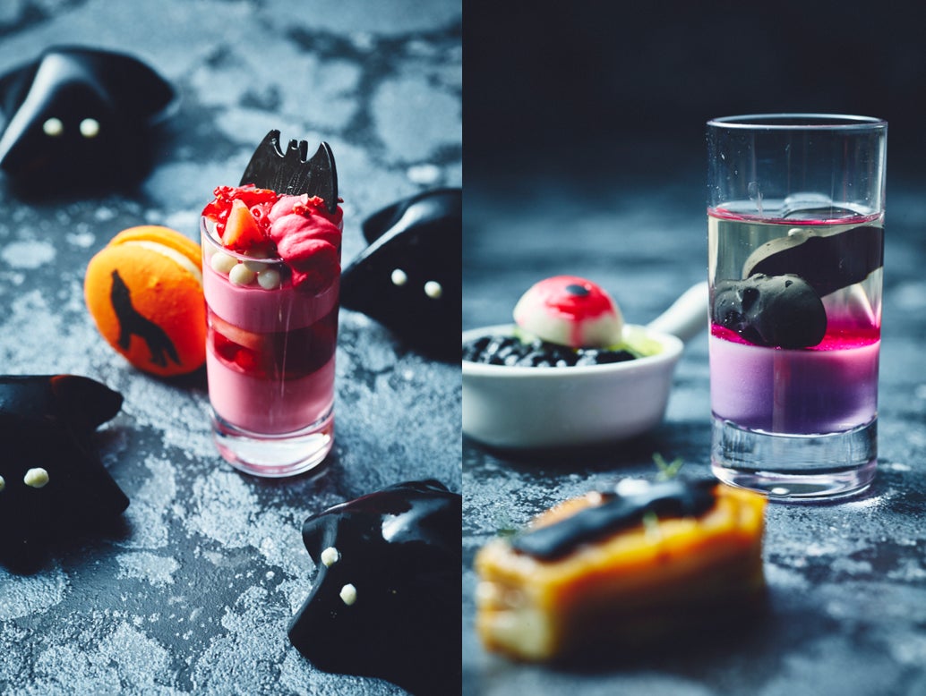 つるんとした食感の赤ワインゼリーに包まれた、かわいらしいフォルムが印象的なオバケの洋ナシタルトレット、ザクロとラズベリーのパンナコッタ、ハイビスカスティージュレのレイヤードに赤いフルーツ&クリームでドラキュラをイメージしたパフェ、紫芋のムースリーヌにソーテルヌゼリーとコンソメのエスプーマで仕上げたスカルゼリーと、 ハロウィン気分を盛り上げてくれるアイテムばかり。スイーツもセイボリーも、カボチャや洋ナシなどの旬の食材を活かし秋の味覚も存分にお愉しみいただけます。