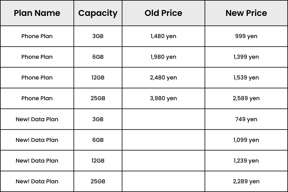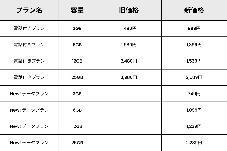 今回の改定では、従来の「データ通信+電話番号」プランに加え、新たに「データ通信のみ」プランを提供開始。料金は749円(税別)からと、よりリーズナブルな価格設定も導入し、お客様のニーズに合わせて最適なプランをお選びいただけるようになりました。
