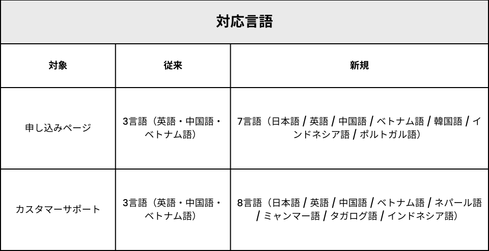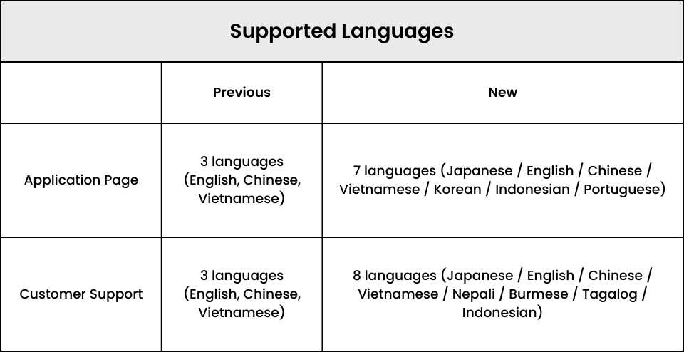 In addition to revising the prices of the existing "Data Communication + Phone Number" plan, we have also introduced a new "Data Communication Only" plan. Furthermore, we have expanded the supported languages for the application page and customer support to a maximum of 8 languages, making it more convenient for more customers.
