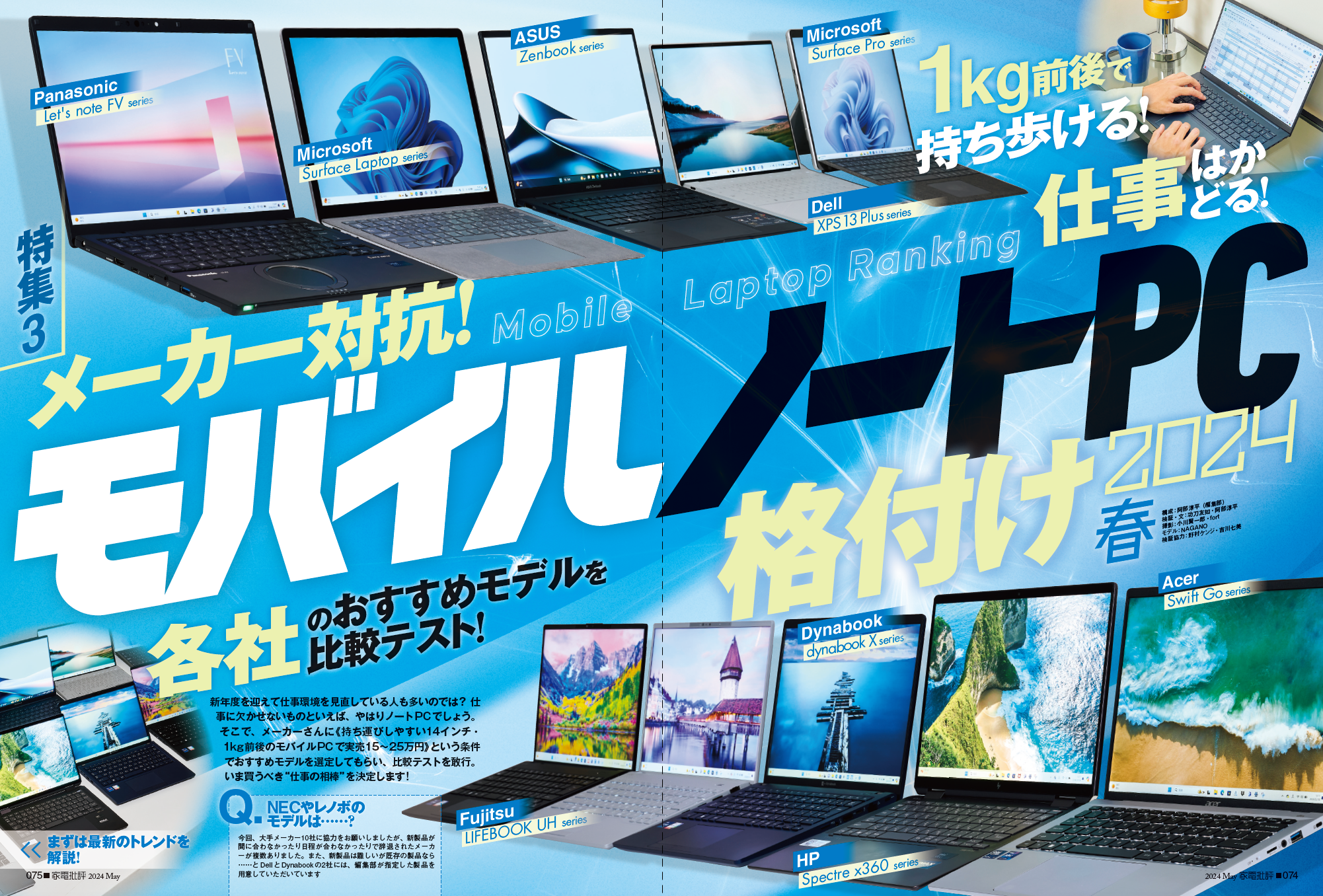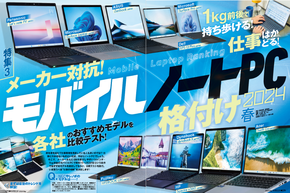 新年度を迎えて仕事環境を見直している人も多いのでは? 仕事に欠かせないものといえば、やはりノートPCでしょう。そこで、メーカーさんに《持ち運びしやすい14インチ・1kg前後のモバイルPCで実売15〜25万円》という条件でおすすめモデルを選定してもらい、比較テストを敢行。いま買うべき“仕事の相棒”を決定します!