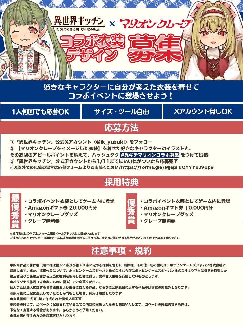 「異世界キッチン 行列のできる現代料理のお店」×「マリオンクレープ」のコラボイベントに登場する衣装デザインを募集いたします。採用されたデザインはコラボイベントにて実際に使用され、採用者にはAmazonギフト券やマリオンクレープグッズ、クレープ無料券をプレゼントいたします。
