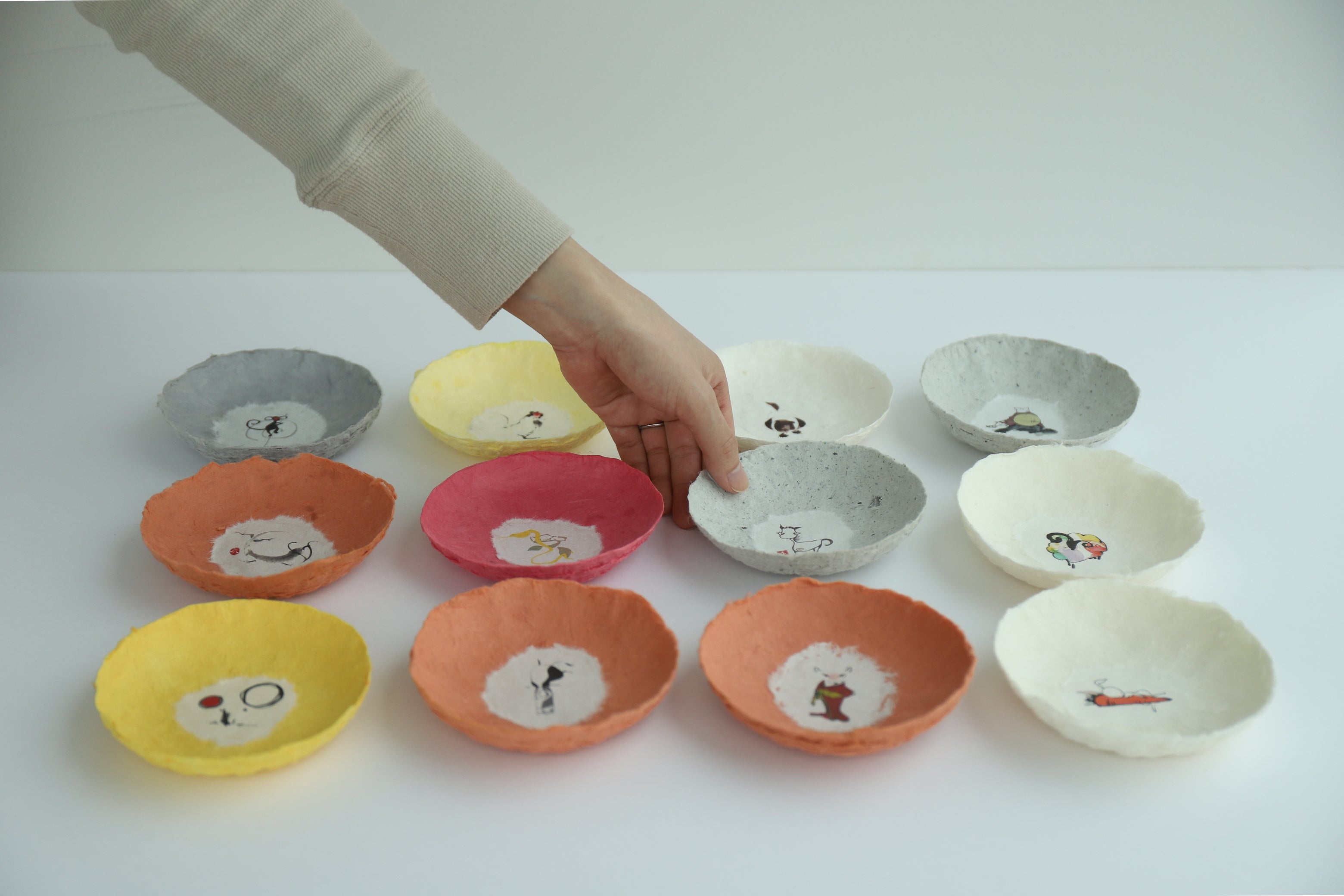 代々伝わる手漉きを守りながら新しい挑戦を続ける尾崎靖製紙所と、書道家兼イラストレーターとして活動する掌花のコラボレーション作品。和紙を豆皿型に固め、干支の文字とイラストが描かれた一品は優しい質感と、チャーミングなデザイン。