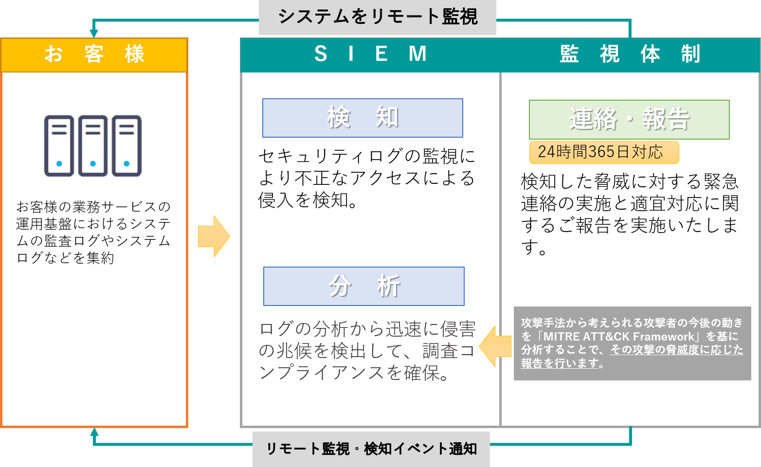 本サービスでは、セキュリティ対策製品のメーカとセキュリティ評価サービスのプロバイダからなるセキュリティ対策のプロ集団として、豊富な人材と実績ある育成体制に基づく高品質な監視サービスや、お客様のセキュリティ対策環境のコンサルティングなど、総合的にセキュリティ対策をサポートします。外部からの侵入がないか、不審な挙動がないかをお客様に代わり24時間365日体制でシステムやサーバーなどで記録される様々なログの監視や、膨大なログ管理の自動化を行い効率的に検知しながら、NCDの知見や分析ノウハウを活かし、不審なログを検知した場合は事象の共有を行うだけでなく、攻撃手法から考えられる攻撃者の今後の動きを「MITRE ATT&CK Framework」を基に分析することで、その攻撃の脅威度に応じた報告を行います。